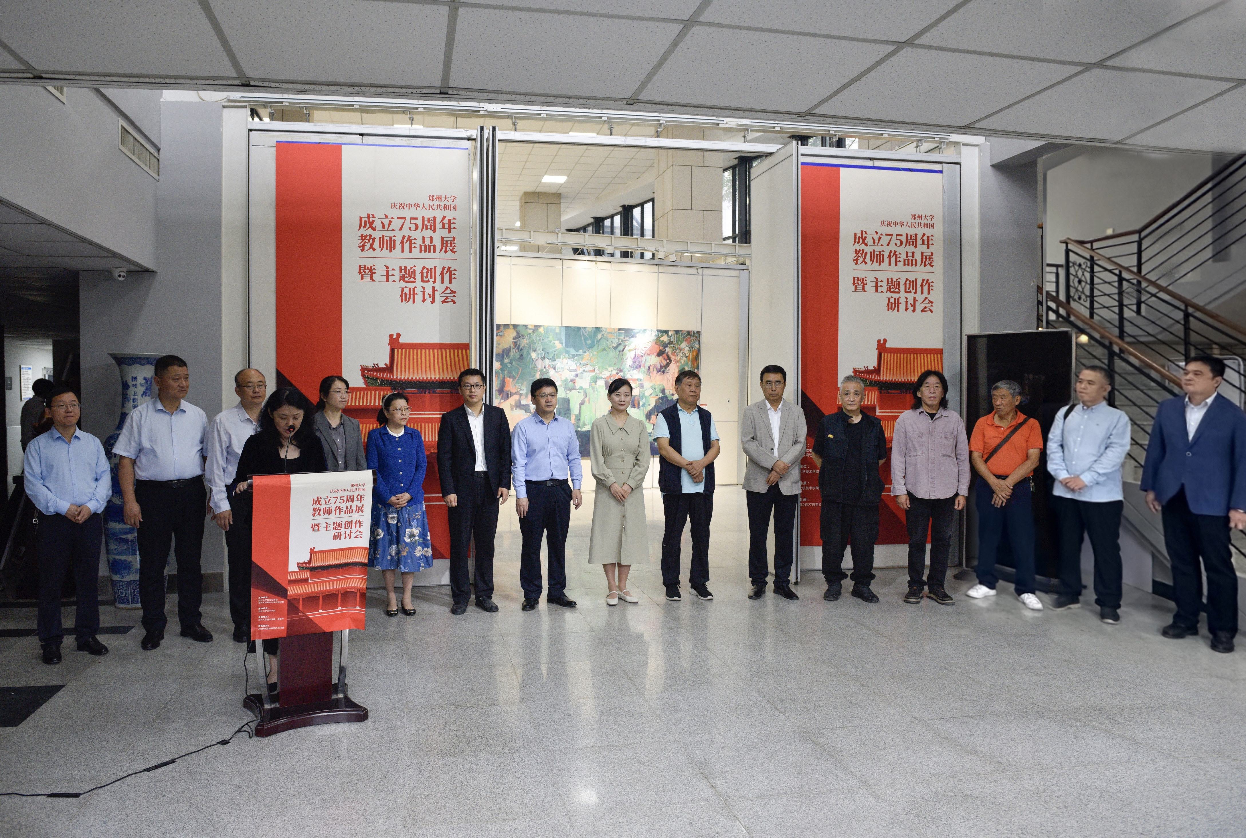 9月27日,由bat365在线中国官网登录入口党委宣传部、规划与学科建设部主办,美术学院承办的“bat365在线中国官网登录入口庆祝中华人民共和国成立75周年美术学院教师作品展暨主题创作研讨会”在主校区举行。校党委常委、纪委书记陈曦出席并宣布展览开幕。中国画学会副会长、河南省美协名誉主席马国强,河南省学校艺术教育协会会长、郑州美术学院校长石品,bat365在线中国官网登录入口党委组织部、党委宣传部、规划与学科建设部及相关部门负责同志参加开幕式。美术学院负责同志主持开幕式。