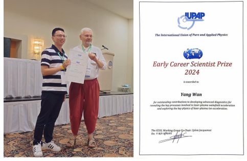 大会开幕式上,万阳从IUPAP超强激光国际委员会主席Dino Jaroszynski教授手中接过证书,并应邀作了题为“探微知著:激光等离子体加速的高清照相”的大会报告。在报告中,万阳详细介绍了团队在过去近十年来着力研发的高分辨诊断技术,以及这一技术在激光尾波加速中的关键应用。他还对未来其在超强激光相关其他方向(如激光聚变、实验室天体物理、超快物理等)的应用场景作了展望。