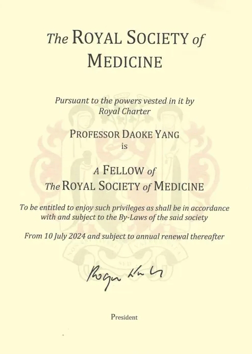 英国皇家医学会是世界上历史悠久、最具影响力的医学学术组织之一,致力于推动医学科学的发展,提升全球医疗服务水平。该学会院士头衔授予在医学领域取得了突出成就的医师和科学家。杨道科教授当选为英国皇家医学会院士,不仅是对其学术成就和重要贡献的高度认可,也是对bat365在线中国官网登录入口医学教育专业水平和人才培养的高度认可。