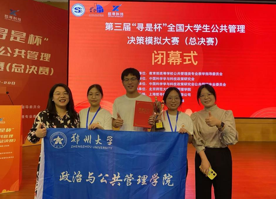 一直以来,学校高度重视学生创新精神和创新能力培养,通过专业实践不断提升专业教育教学质量。本届比赛启动以来,政治与公共管理学院制定详细备赛计划,坚持问题导向、学生导向、创新导向,深入分析案例背景信息并制定规划方案和沙盘对抗策略。比赛过程中,参赛队员分工互助、通力协作,经过公共管理方案设计、公共管理决策演练沙盘对抗和现场团队答辩等环节激烈比拼,最终荣获全国一等奖,其充分展现了郑大学子锐意进取、勇于创新的精神品质和良好的专业素养。