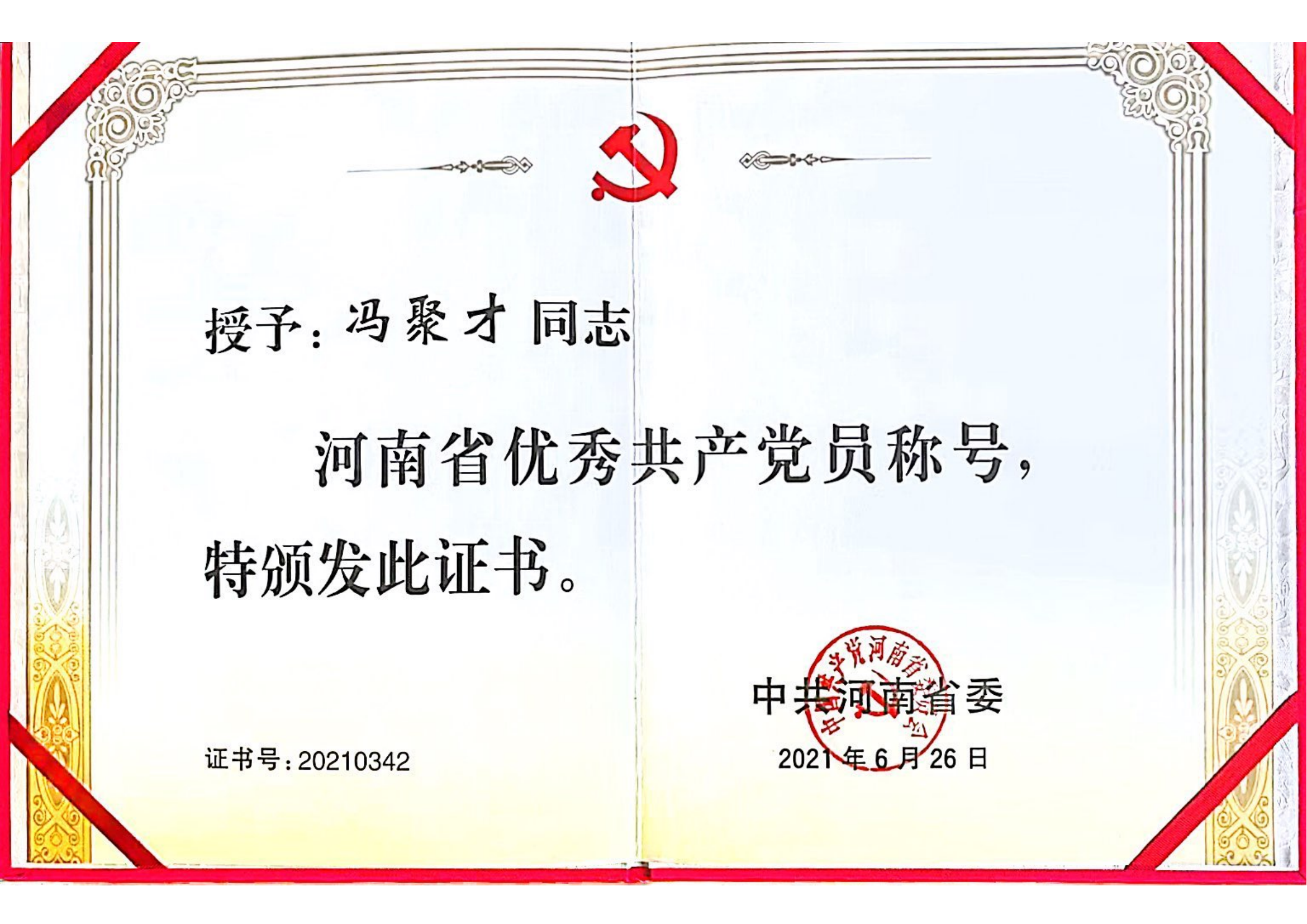 获河南省优秀共产党员荣誉称号