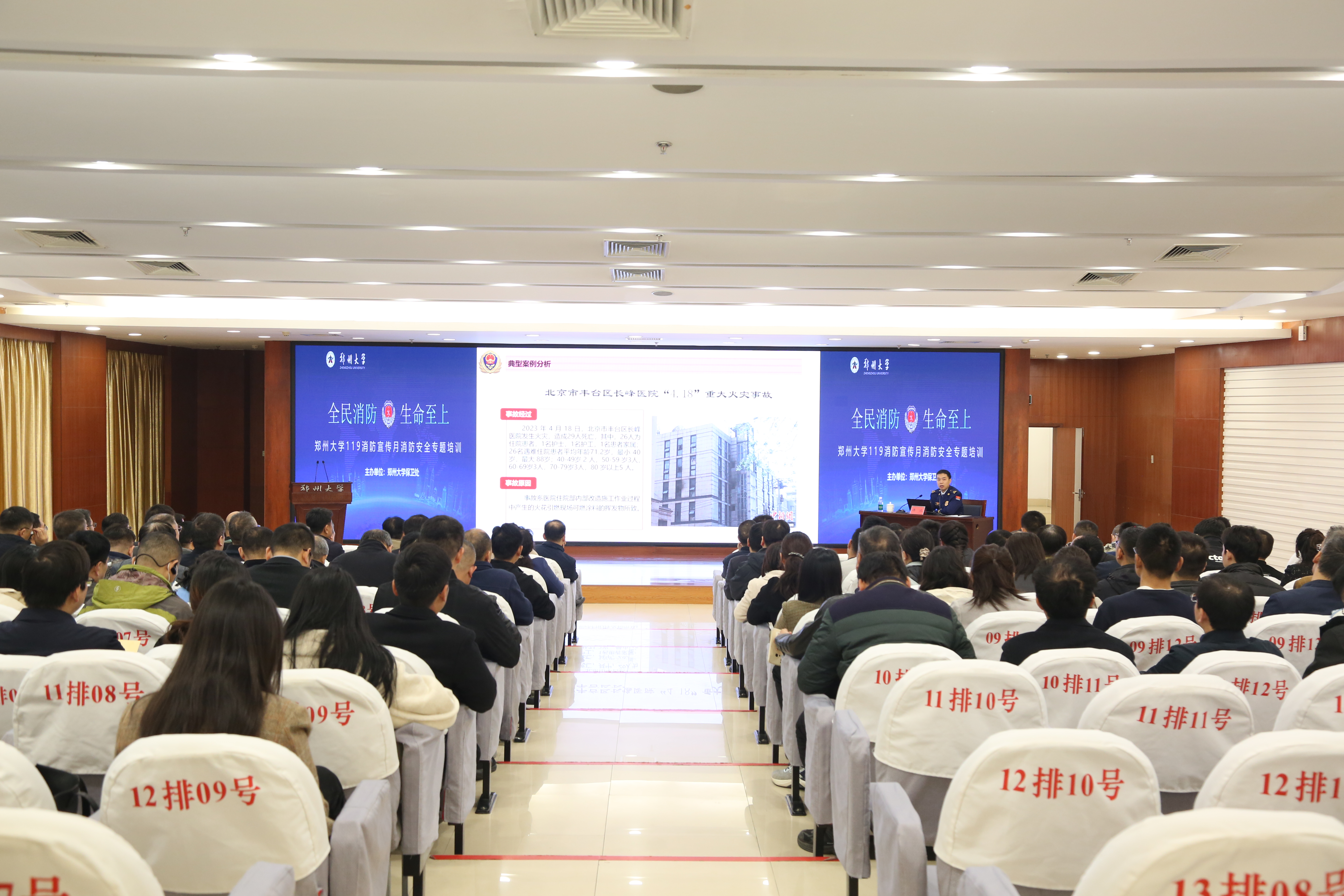 11月8日上午,由bat365在线中国官网登录入口保卫处主办的119消防宣传月消防安全专题培训在主校区举行。校党委常委、副校长徐东升出席活动,校部机关、学院、科研机构、直附属单位相关负责同志参加活动。此次培训特邀郑州市消防救援支队防火监督处一级指挥员许冰授课。他围绕“全面落实消防安全主体责任,防范化解重大消防风险”主题,从火灾形势及典型案例、消防设施管理、常见火灾隐患及日常火灾防范等方面,深入系统阐释了消防应知应会及疏散逃生技能常识,并针对学校消防安全管理现状提出了宝贵意见建议。