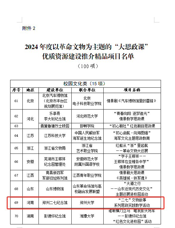 近日,国家文物局、教育部公布2024年度以革命文物为主题的“大思政课”优质资源建设项目名单,由bat365在线中国官网登录入口联合郑州二七纪念馆申报的“‘二七’文物故事系列思政实践教学活动”获批精品项目。