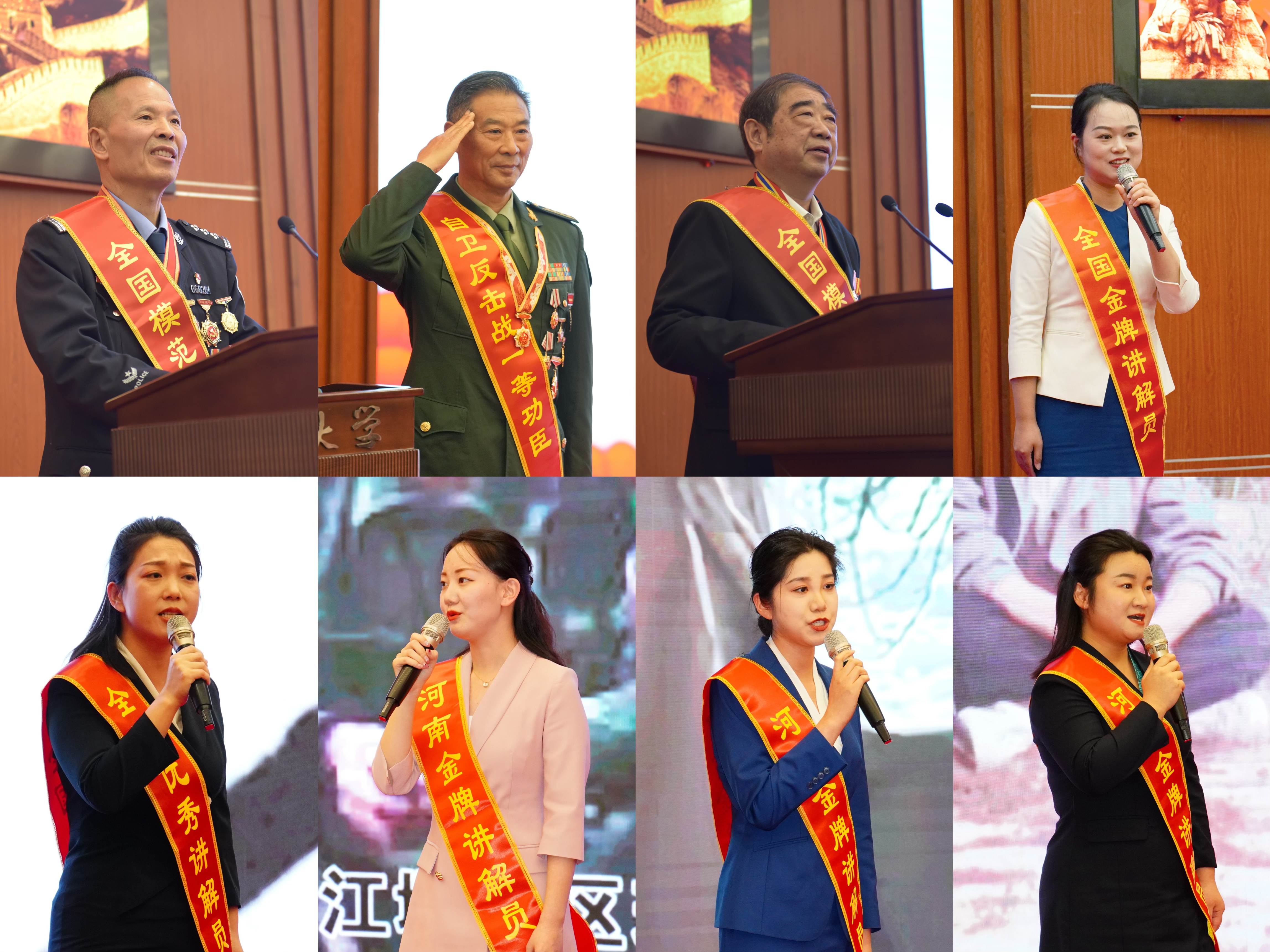 全国模范退役军人、特级优秀人民警察陈晓磐,原漯河军分区司令员、战斗英雄李远征,全国模范退役军人、中国好人李东亮分享了自己和战友在战场上不怕牺牲、冲锋陷阵的英勇事迹,退役后在不同岗位服务人民、投身公益的感人故事,生动诠释了忠诚担当、爱国奉献的军人本色。全国金牌讲解员、新县烈士陵园社会教育部主任张亚君,全国优秀讲解员、渑池县退役军人事务局干部程清,郑州烈士陵园干部、河南省金牌讲解员常艺,杨靖宇将军纪念馆干部、河南省金牌讲解员魏霖霖,洛阳烈士陵园干部、河南省金牌讲解员李丹阳分别讲述了革命先烈用生命谱写的英雄史诗,带领师生重温中国共产党波澜壮阔的革命史、艰苦卓绝的奋斗史、可歌可泣的英雄史。