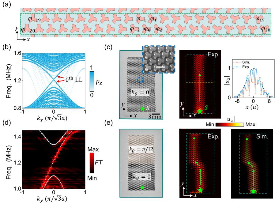 研究团队基于合成维度的方法,设计了一种二维硅基片上声子晶体,利用系统结构参数构造(2+1)维片上外尔系统,观测到了弹性波手性朗道能级和新奇的体传输现象。该工作通过控制散射体的几何转角来实现合成外尔系统,在此基础上引入梯度质量项,构造一个平面内的赝磁场,诱导产生手性朗道能级。利用微加工技术在SOI晶圆上制备了声子晶体样品,通过激光测振的方法观测到第零朗道能级的色散关系和位移场分布。最后,利用合成参数构造异质结构,实现灵活的波束操控。这种通过面内赝磁场诱导产生的手性体通道,为体波的传输提供了全新的操控方法,有望用于声波导器件的设计。