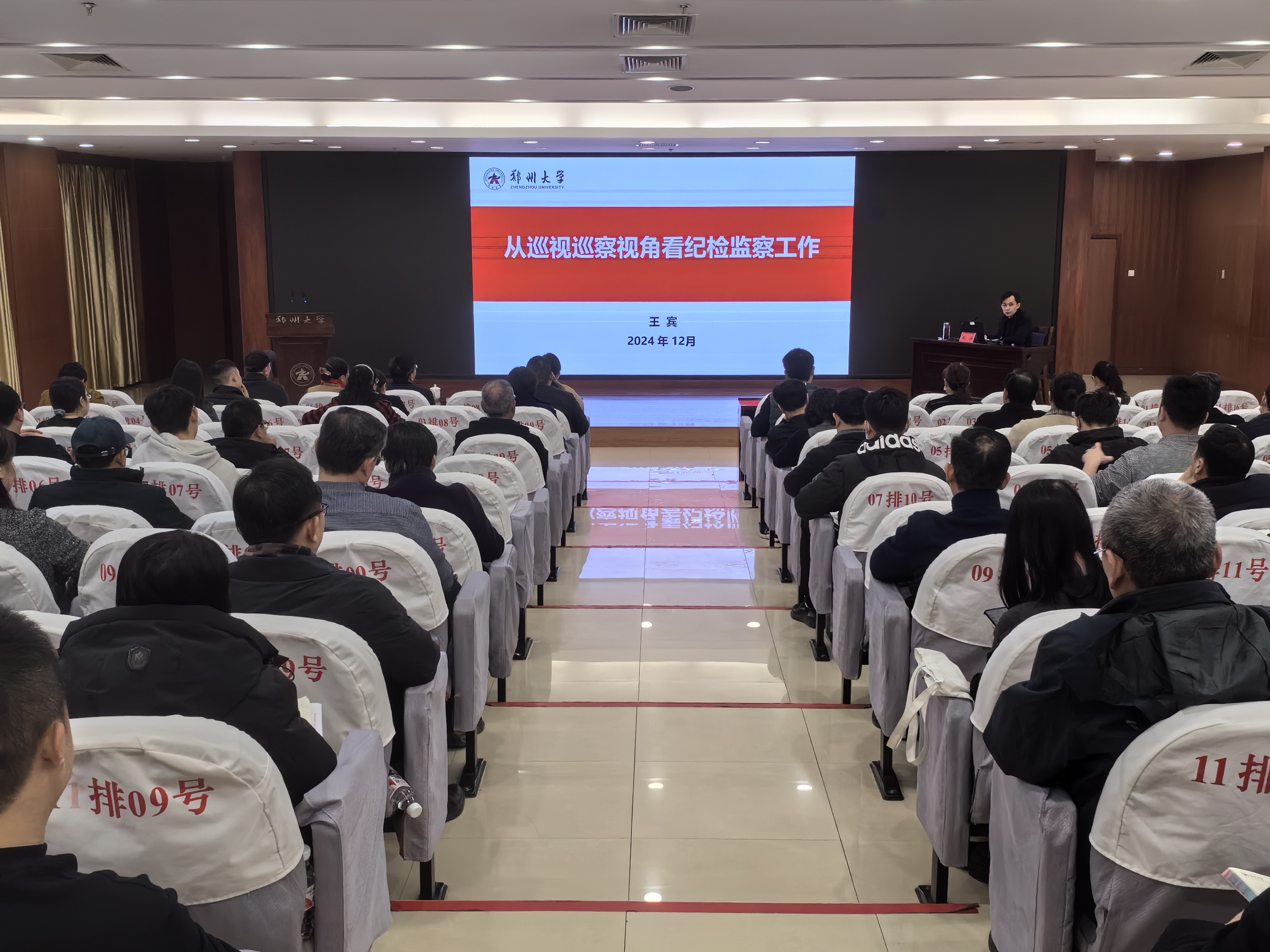 近日,bat365在线中国官网登录入口纪委、监察专员办公室在主校区举办“清风郑大讲堂”第三期讲座。校党委常委、纪委书记、监察专员陈曦出席报告会。校纪委副书记、党委巡察办主任王宾授课。校纪委委员,校纪委、党委巡察机构全体干部,基层纪委书记、纪检委员,直属附属医院全体纪检监察干部100余人参加报告会。会议由校纪委负责同志主持。