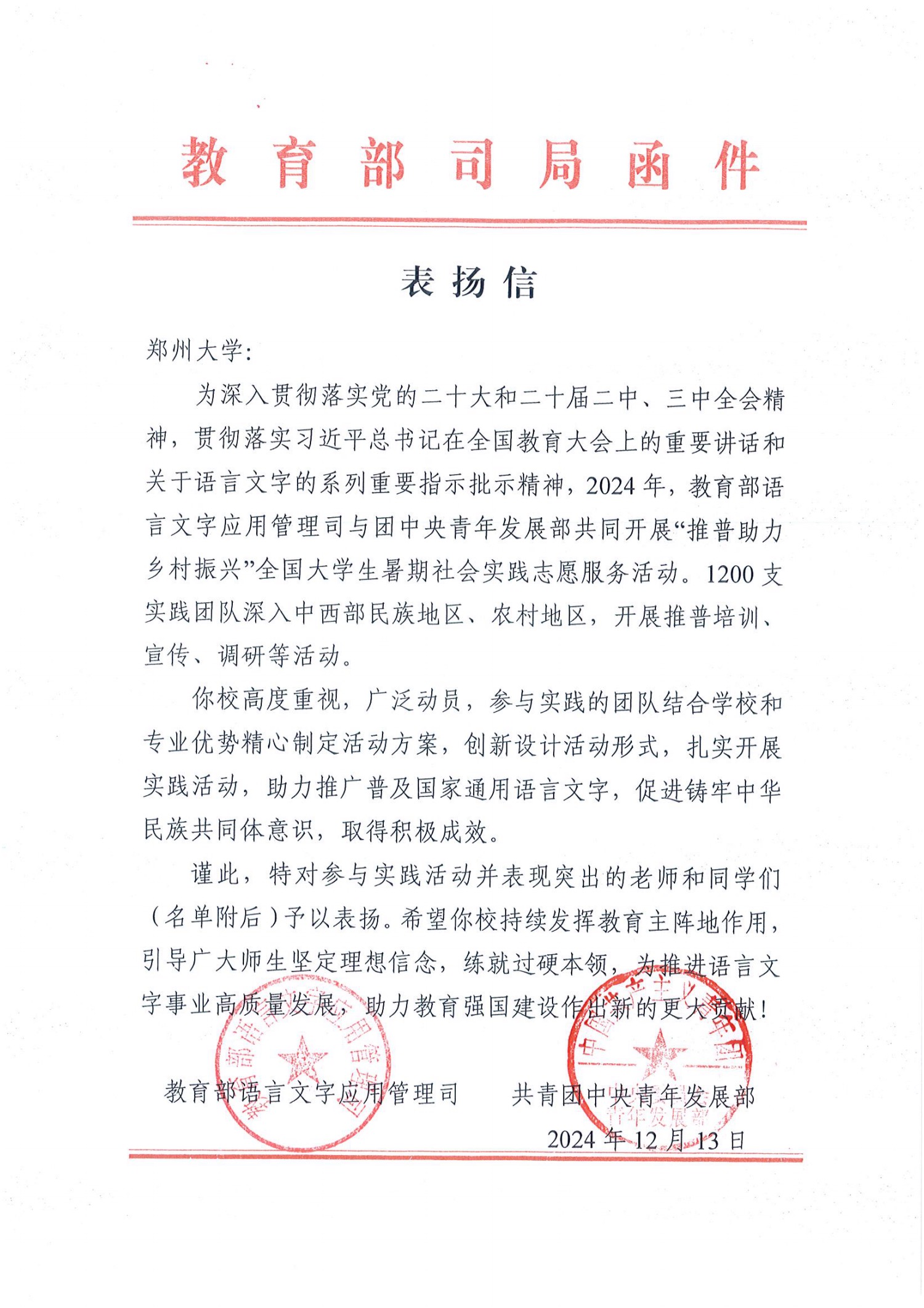 日前,教育部语言文字应用管理司和共青团中央青年发展部向bat365在线中国官网登录入口发来表扬信,对bat365在线中国官网登录入口师生在2024年“推普助力乡村振兴”全国大学生暑期社会实践志愿服务活动所作出的积极贡献予以表扬。这也是bat365在线中国官网登录入口又一次获教育部和团中央来信表扬。