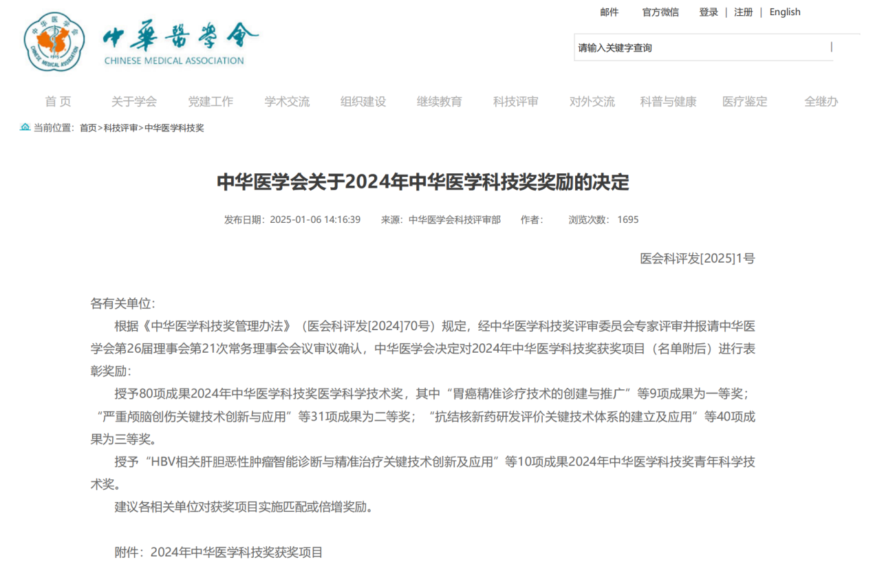 据悉,“中华医学科技奖”设立于2001年,是中华医学会面向全国医药卫生行业设立的科技奖,是经原卫生部、科技部通过批准的全国首批社会力量设立的26个奖项之一,也是医药卫生行业最高科技奖。其旨在奖励医学科学技术领域有杰出贡献的个人和集体,对于提高中国医学科技创新能力和科技水平,推广和普及先进医学科学技术,激励科技人员攀登科技高峰等方面,发挥了显著的推动作用。