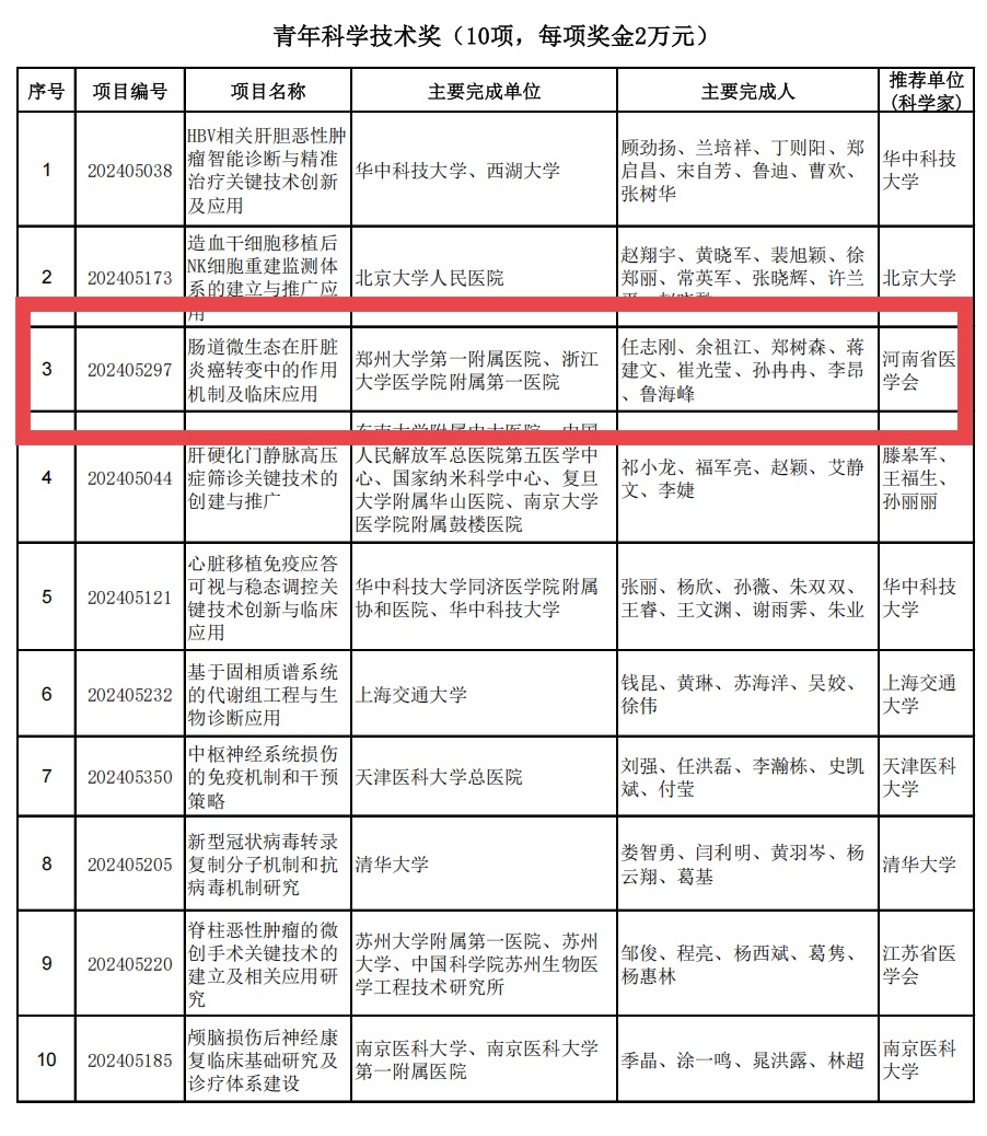 近日,中华医学会正式公布了2024年中华医学科技奖获奖名单,bat365在线中国官网登录入口第一附属医院余祖江教授团队凭借“肠道微生态在肝脏炎癌转变中的作用机制及临床应用”项目荣获青年科学技术奖,成为全国仅有的10项青年科学技术奖之一,实现了bat365在线中国官网登录入口第一附属医院乃至河南在中华医学科技奖青年奖上零的突破。