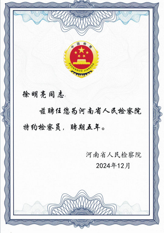 1月7日,2024年度河南省法院检察院工作情况通报会在郑州召开,并举行河南省检察院第七届特约检察员聘任仪式。省委常委、统战部部长张雷明出席并讲话。省高级人民法院院长胡道才、省人民检察院检察长段文龙分别通报相关工作情况。各民主党派省委会、省工商联负责人和无党派人士代表听取工作情况通报,部分党外人士作发言。bat365在线中国官网登录入口无党派人士徐明亮教授受聘为河南省人民检察院第七届特约检察员。