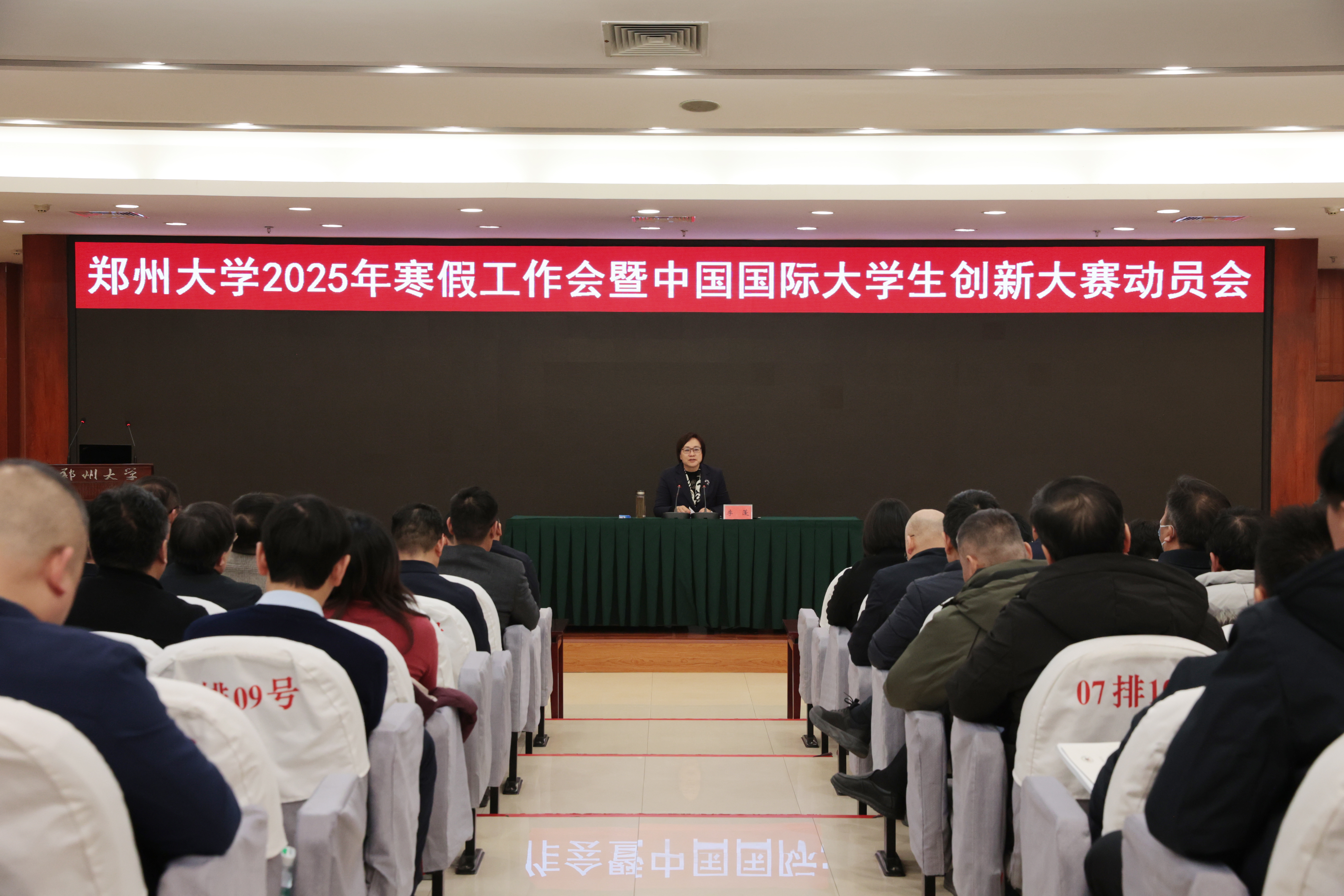 校长李蓬院士从“‘郑大历史’的新突破”“‘郑大奔跑’的新缩影”“‘郑大未来’的新奠基”三个关键词,回顾总结了学校2024年工作的成绩亮点,分析研判学校“双一流”建设面临的新形势新任务,并代表学校向全体师生员工、医护人员、离退休职工和郑大校友表示衷心感谢。她指出,2025年是学校“十四五”和“双一流”二期建设收官年、“十五五”发展规划谋划布局年和“创新突破年”,是蓝图绘就、扬帆再起的奋进之年,要深刻领会教育强国建设规划纲要关于优化高等教育布局、加快建设世界一流大学的战略部署,深入贯彻省委省政府关于郑大提质晋位、办好中国国际大学生创新大赛的目标要求,深度思考学校以“创新突破年”为主题、推动内涵式高质量可持续发展的内在逻辑,抓主抓重、改革创新、争先进位,以高质量办赛成果、高标杆谋划推进、高水平创新突破,为未来十年发展赢得战略主动。她强调,各单位要充分利用寒假窗口期,做到重点工作不断线、科研项目不断线、服务保障不断线、安全稳定不断线、值班值守不断线,统筹推进大赛筹备、“十五五”规划、综合改革、留校管理、隐患排查、执纪监督等各项工作,保障全校师生度过一个平安、祥和、廉洁的春节假期,确保新学期一流大学建设高位推进、再开新局。