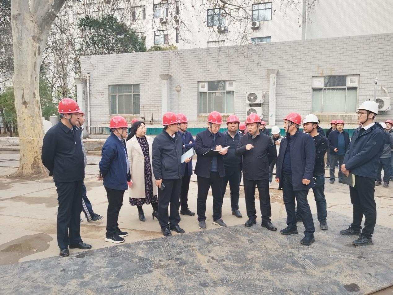 在南校区继续教育学院西1、西2号楼加固维修工程现场,徐东升听取施工单位工程建设汇报,实地检查工程进度、质量安全及施工管理情况,现场协调解决问题。