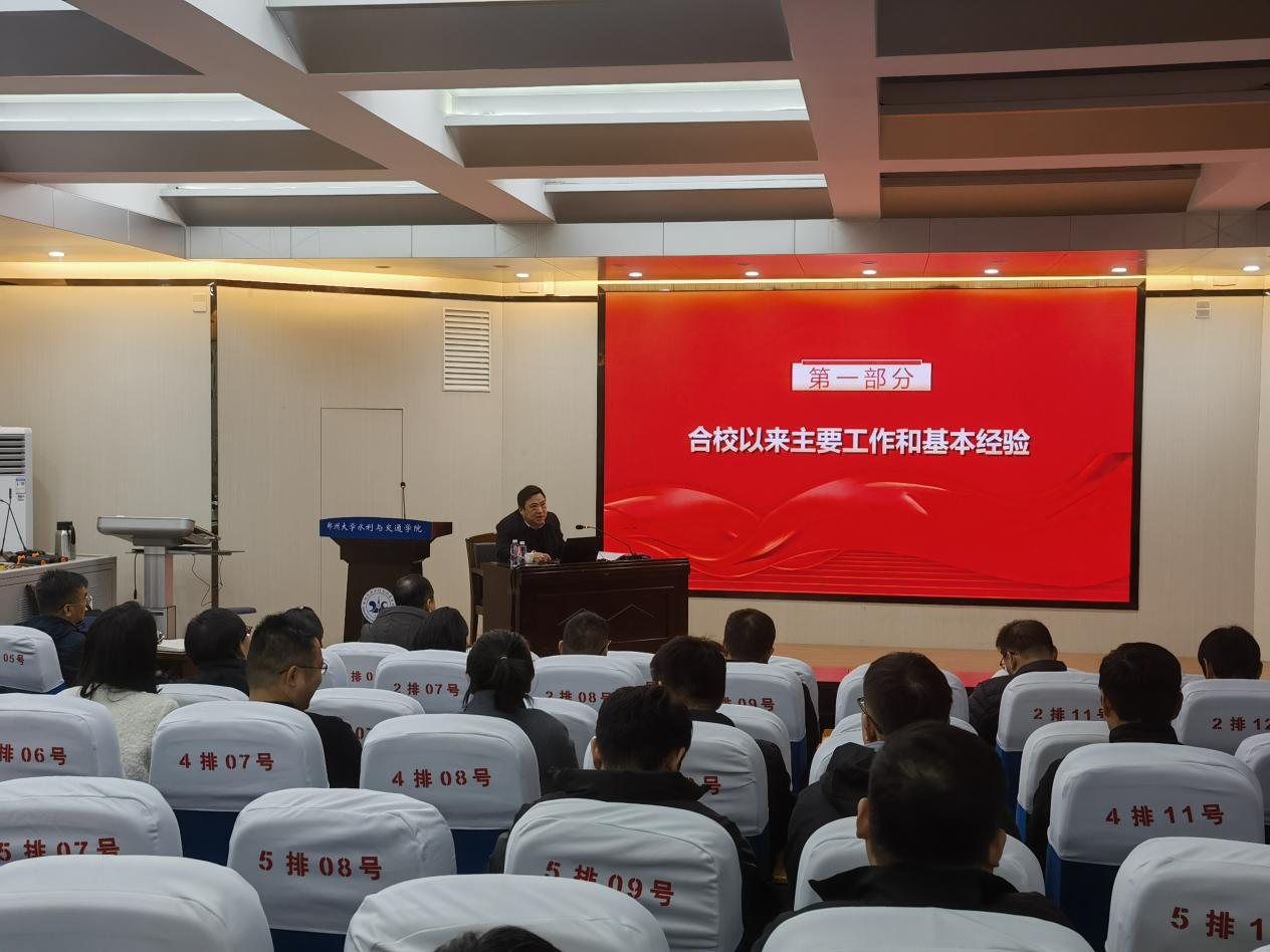 胡少伟围绕学校第四次党代会精神,深刻阐释了学校第四次党代会召开的历史意义。他强调,要紧紧围绕学校“全面建设一流大学”的总体目标,在“三步走”的战略引领下,全面加强党的建设的“七个坚定不移”,重点部署以人才培养、学科建设等为核心的“九大任务”,奋力谱写中国特色世界一流大学建设新篇章。他结合水利工程学科建设现状,号召全体师生团结一致、凝心聚力,把学习贯彻学校党代会精神与推进水利工程一流学科建设紧密结合起来,持续推进学院学科专业一体化改革,聚焦大项目、大平台,加快水利工程综合实验平台建设进度,在服务国家战略和区域经济发展中勇于担当作为。