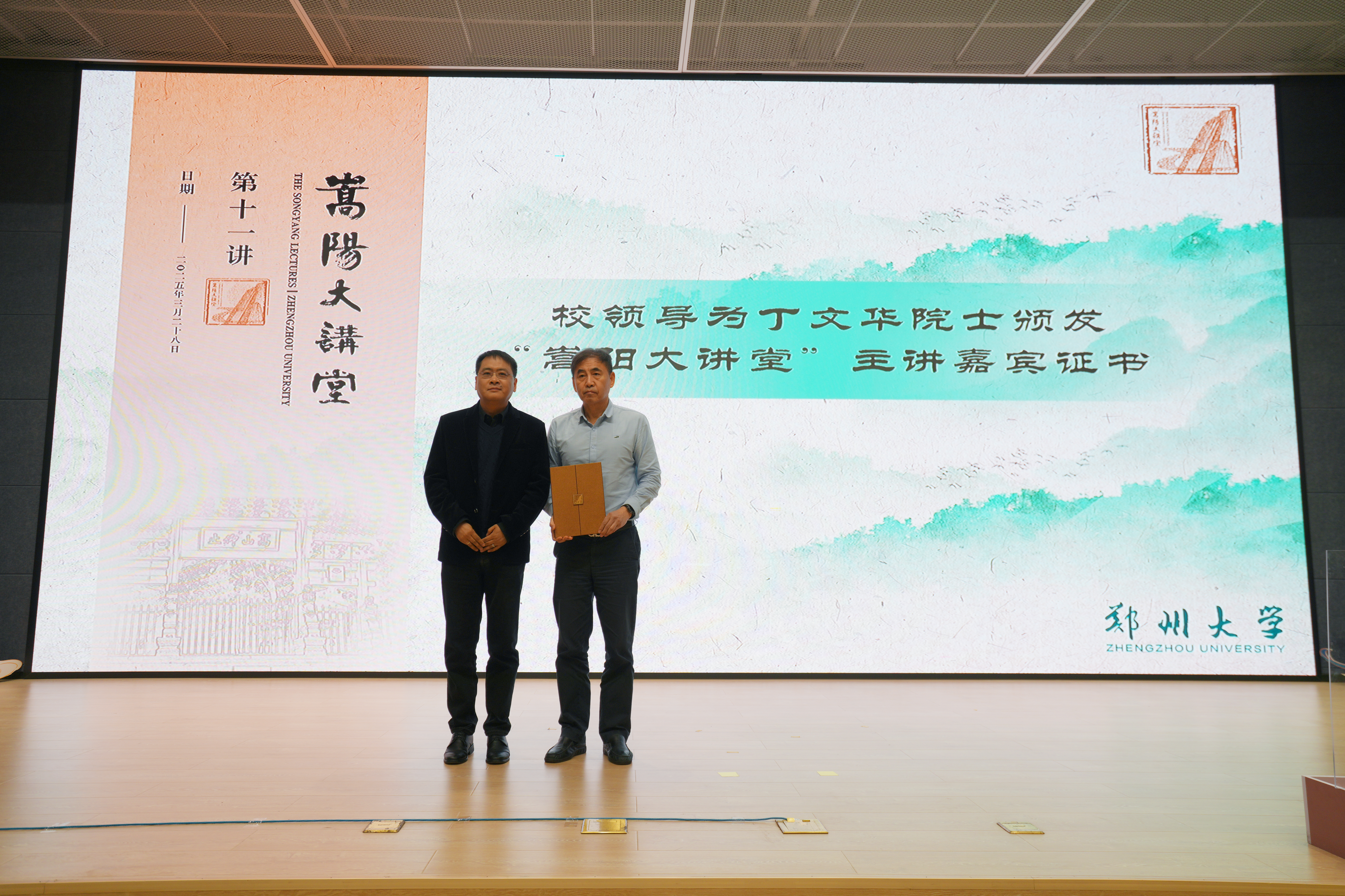 杨天若为中国工程院院士、广播电视技术专家丁文华颁发了“嵩阳大讲堂”主讲嘉宾证书。