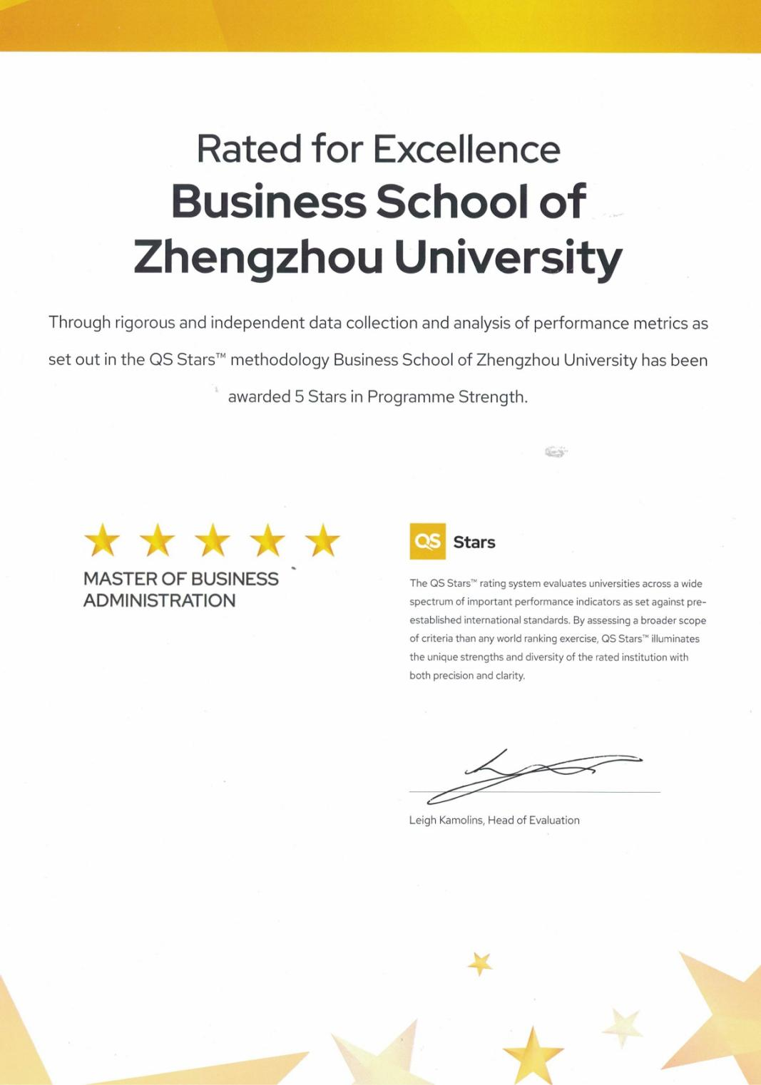 近日,国际高等教育评估机构Quacquarelli Symonds(简称QS)发布最新QS Stars认证结果,bat365在线中国官网登录入口MBA项目凭借毕业率、就业率、师资结构、学术资源与学生发展支持等多个核心指标的优势表现,荣获QS Stars五星认证。该项目是河南省首个获得QS Stars五星认证的MBA项目。