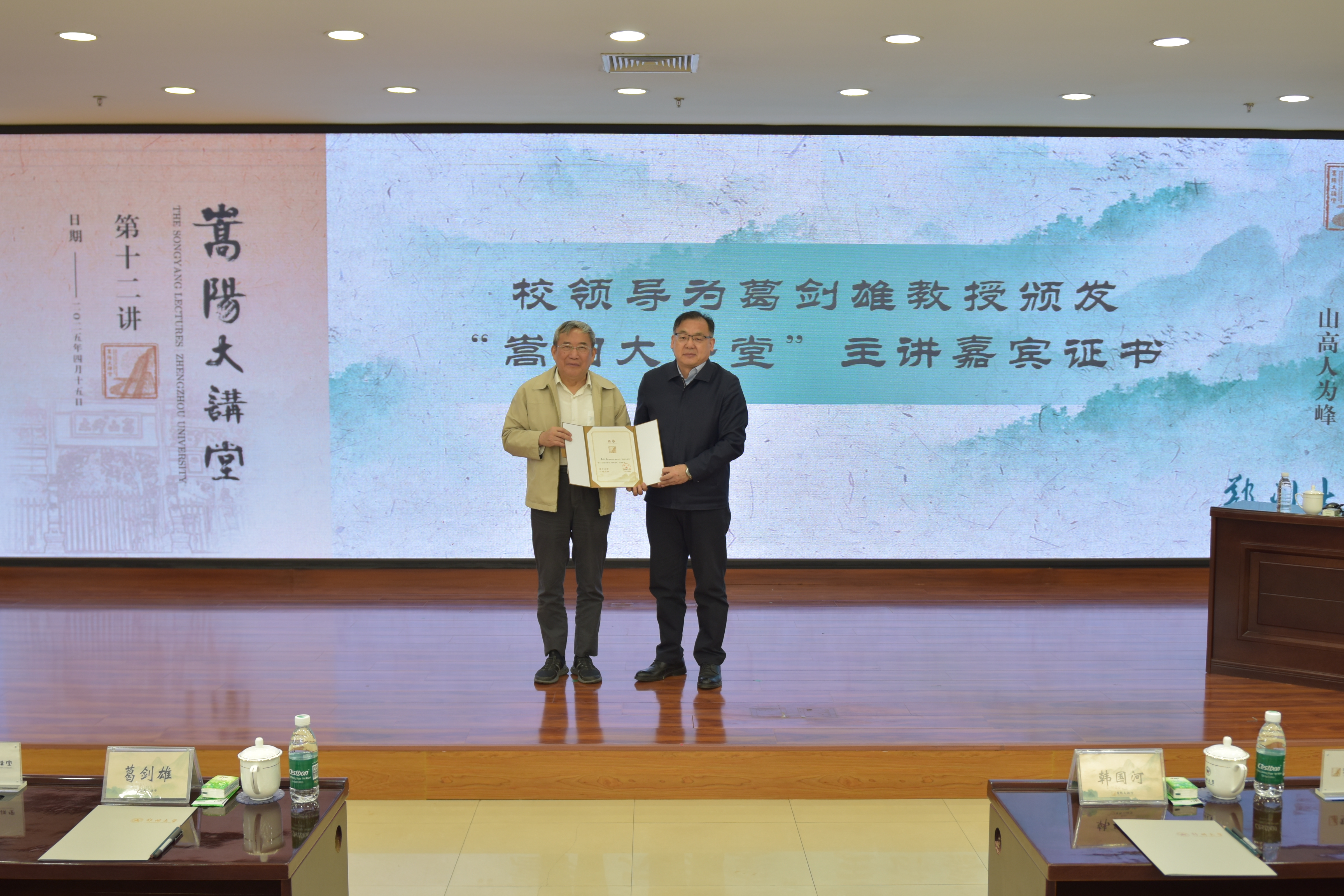 韩国河为葛剑雄颁发“嵩阳大讲堂”主讲嘉宾证书