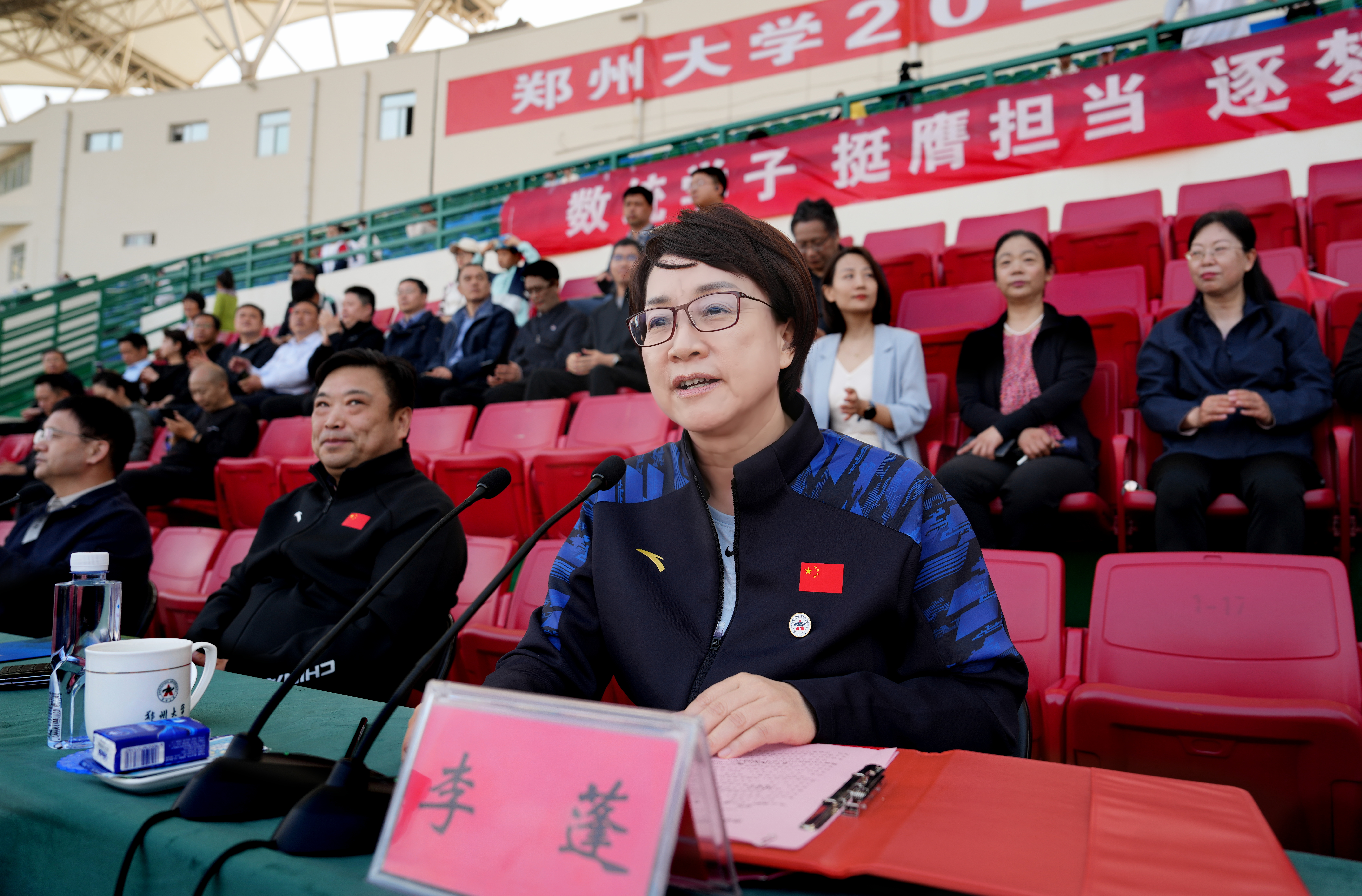 李蓬致闭幕辞。她代表学校和大会组委会向全体参赛运动队、运动员、教练员、裁判员、工作人员以及为本次运动会辛勤付出的师生和有关单位表示衷心感谢,向获奖单位和个人表示祝贺。她表示,本届阳光体育运动会是学校落实健康中国、体育强国建设精神,深化立德树人根本任务的重要举措。全体裁判员严格遵守竞赛规则,积极履行自身职责,运动员顽强拼搏、奋勇争先,赛出了风尚,展现了蓬勃向上的精神面貌、锐意进取的斗志、团结友爱的氛围,充分彰显了一流大学建设进程中郑大人的精气神。她希望全校师生以本次运动会为契机,积极参加体育活动,自觉培养运动习惯,树立终身体育意识,在体育锻炼中增强体质、磨炼意志、健全人格,为健康成长成才、服务中国式现代化建设提供身体保障与精神支撑!
