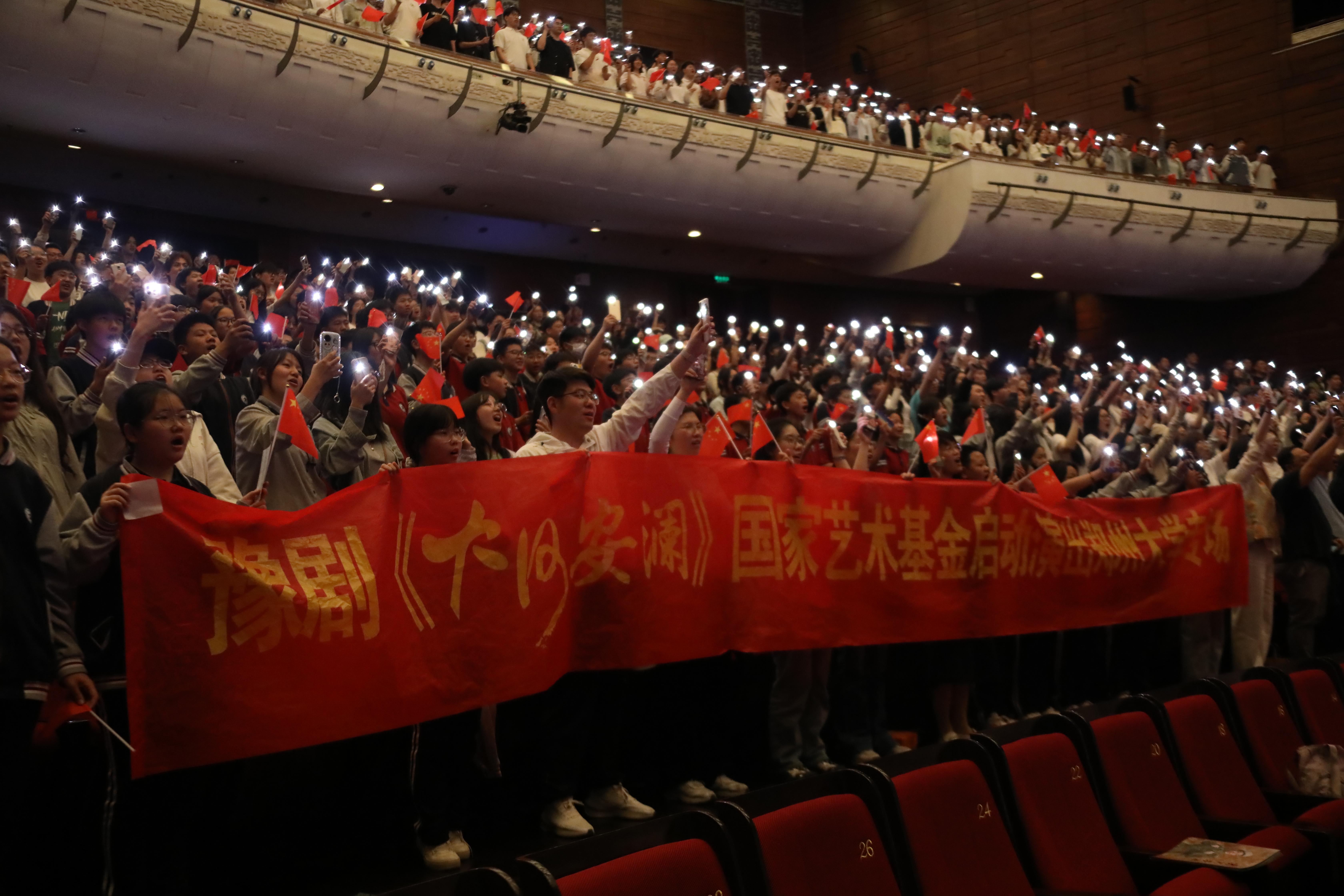 豫剧《大河安澜》聚焦黄河流域生态保护和高质量发展主题,以两代“治河人”守护母亲河的壮阔历程为主线,通过跌宕起伏的剧情和精湛的舞台呈现,展现了黄河沿岸人民与自然抗争、守护家园的壮丽史诗,诠释了中华民族坚韧不拔、生生不息的精神品格,传递了人与自然和谐共生的时代强音。艺术家们以饱满的情感和细腻的表演,赢得现场观众阵阵掌声。演出结束后,全体师生起立合唱《保卫黄河》,激昂的旋律与铿锵的歌词将现场氛围推向高潮,彰显了bat365在线中国官网登录入口师生赓续红色血脉、勇担时代使命的坚定决心。