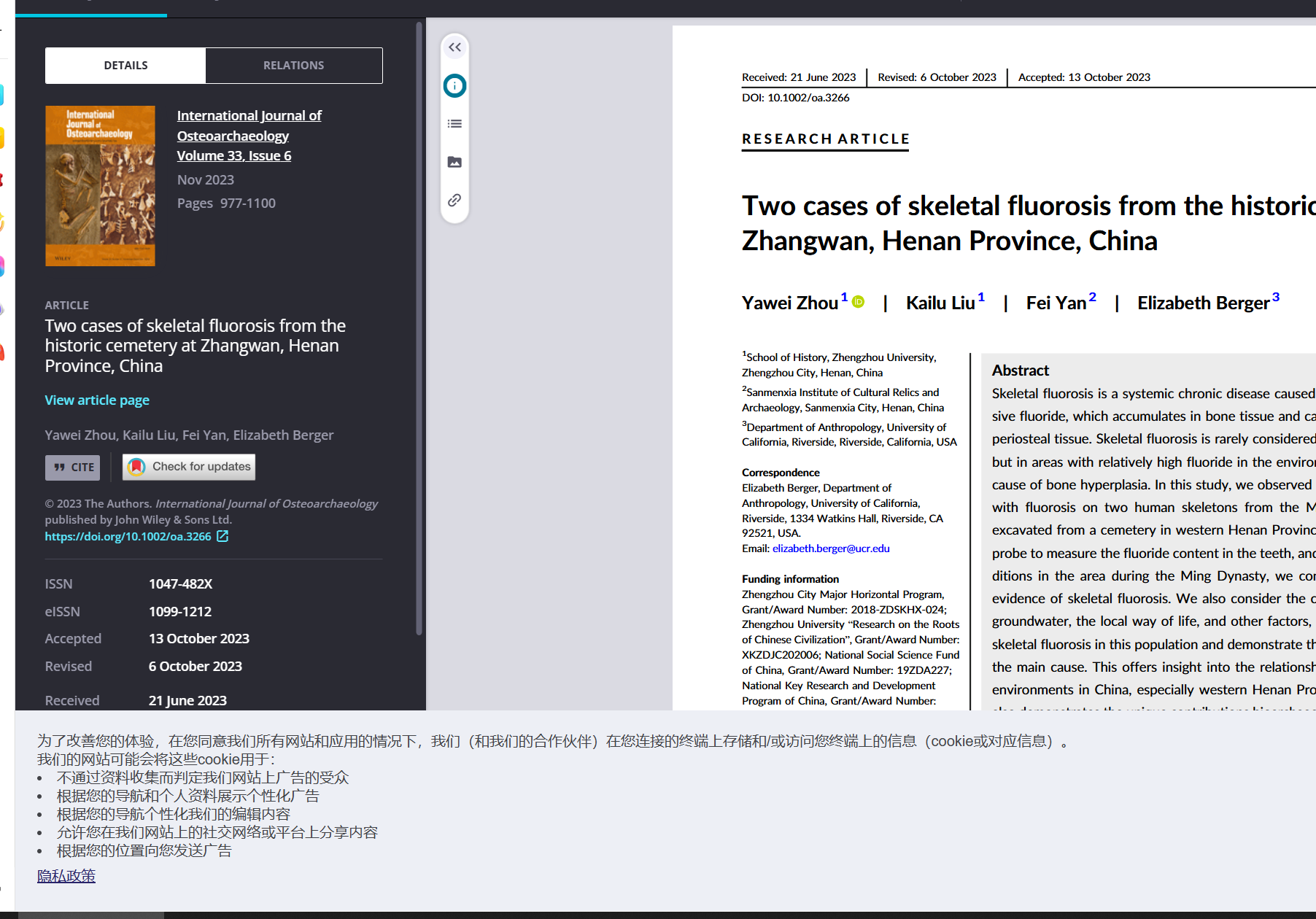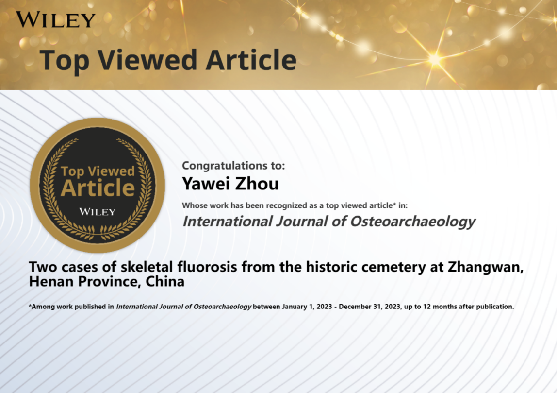 近日,bat365在线中国官网登录入口“中华源”考古实验室团队在国际期刊《国际骨质考古学杂志》(International Journal of Osteoarchaeology)上发表的科研论文“Two cases of skeletal fluorosis from the historic cemetery at Zhangwan, Henan Province, China”名列Wiley系列杂志2024年最高阅读量前10%,荣获Wiley杂志高阅读量作者奖。该论文由我校“中华源”考古实验室周亚威教授团队、美国加州大学河滨分校人类学系Elizabeth Berger博士和三门峡市仰韶文化研究中心燕飞馆员合作完成。