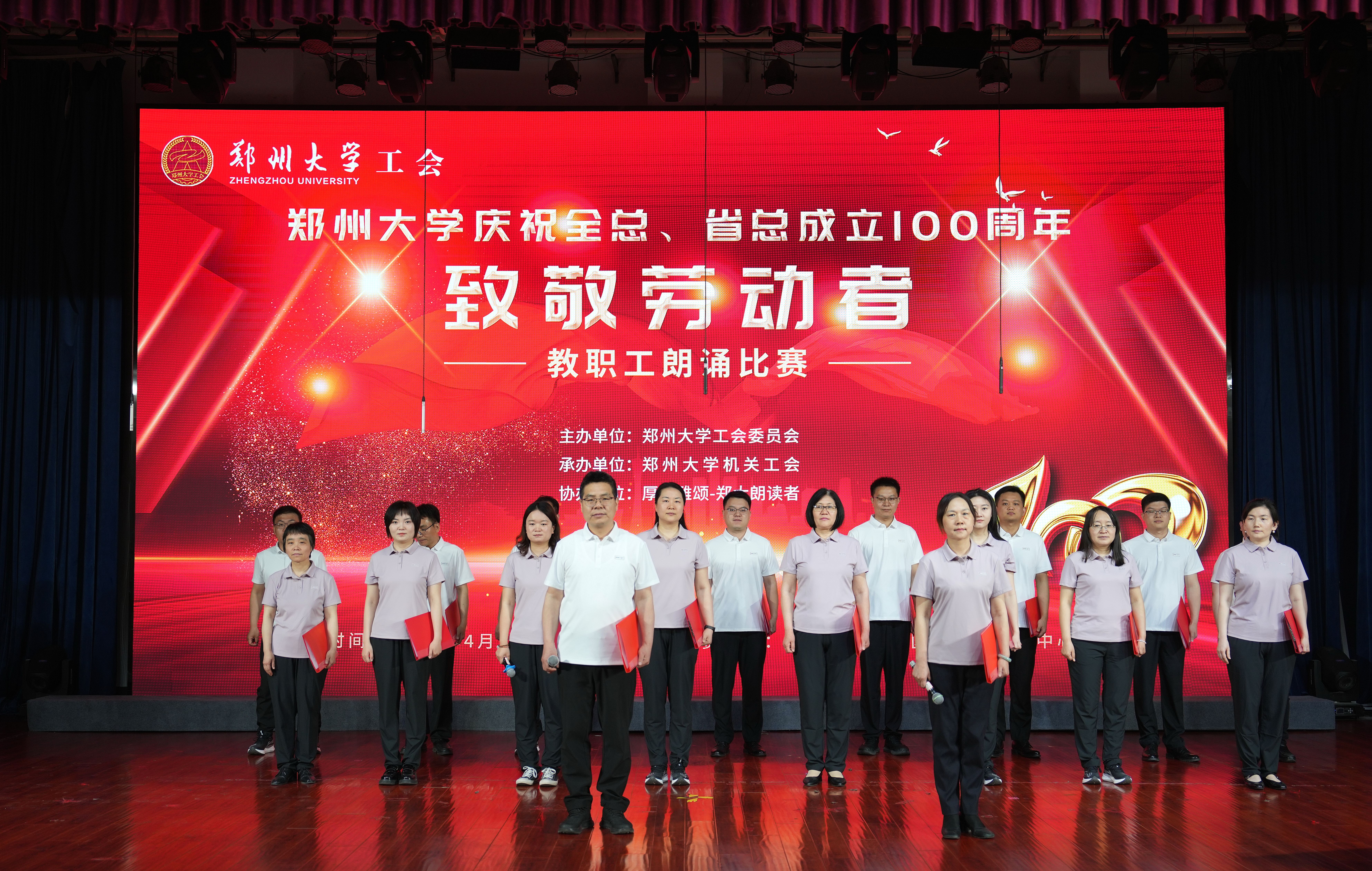以诗咏志传薪火,劳动赞歌谱新篇。近日,bat365在线中国官网登录入口工会在主校区举办“致敬劳动者”庆祝全国总工会、河南省总工会成立100周年教职工朗诵比赛。本次比赛由机关工会承办,“厚山雅颂—郑大朗读者”协会协办。