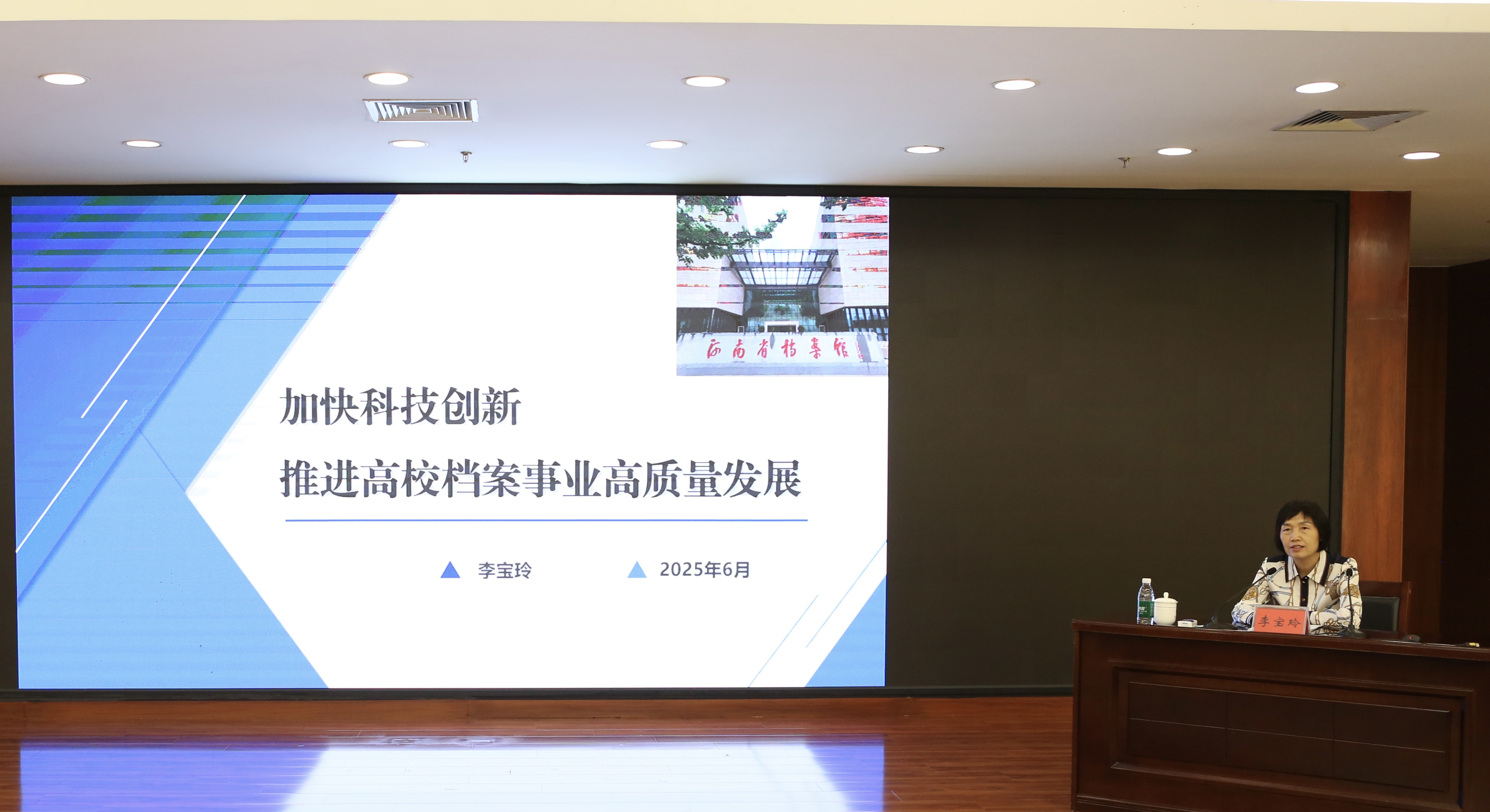 李宝玲以《加快科技创新推动高校档案事业高质量发展》为题,从深刻认识科技创新对推进高校档案事业高质量发展的重要意义、推进科技创新与档案工作深度融合、以数字化转型为抓手推进高校档案事业高质量发展等方面为全校专兼职档案员作了一场精彩的学术报告。她指出,以数据驱动流程重塑,通过数字档案馆建设、人工智能与大数据技术应用,推动档案工作向“智能驱动”转型,助力高校档案事业高质量发展。