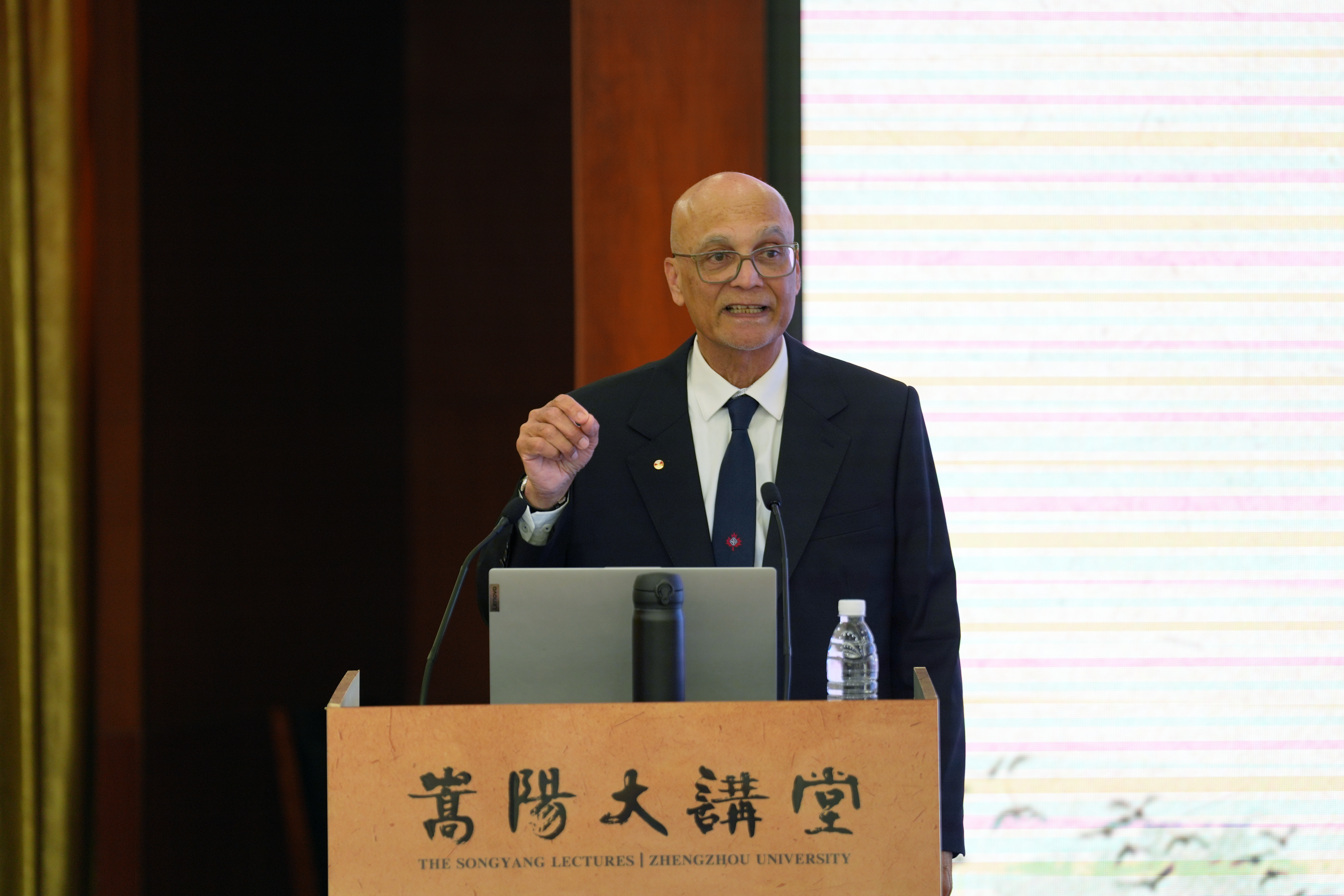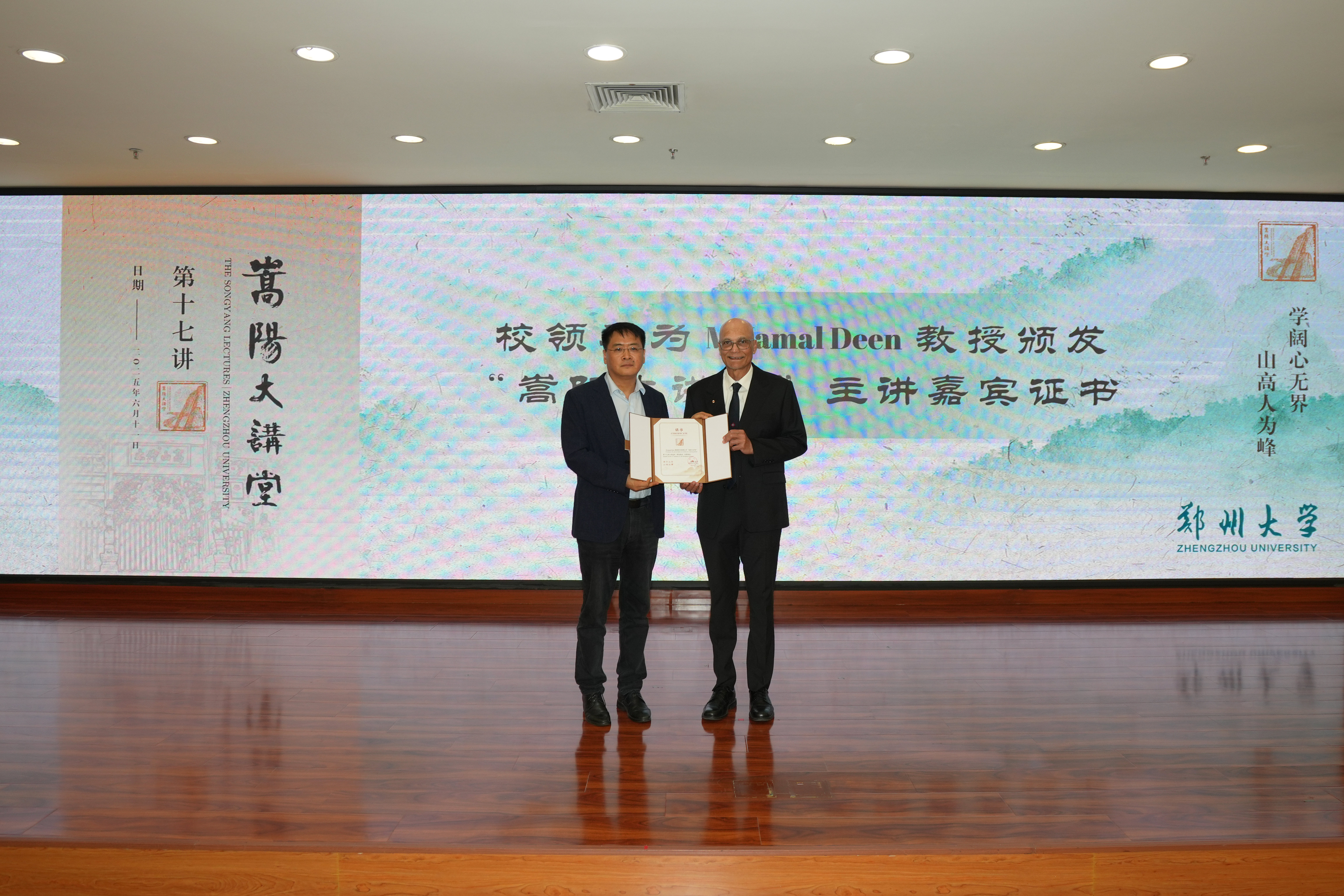 杨天若为加拿大皇家科学院院士、中国科学院外籍院士、加拿大麦克马斯特大学杰出教授M. Jamal Deen颁发“嵩阳大讲堂”主讲嘉宾证书。