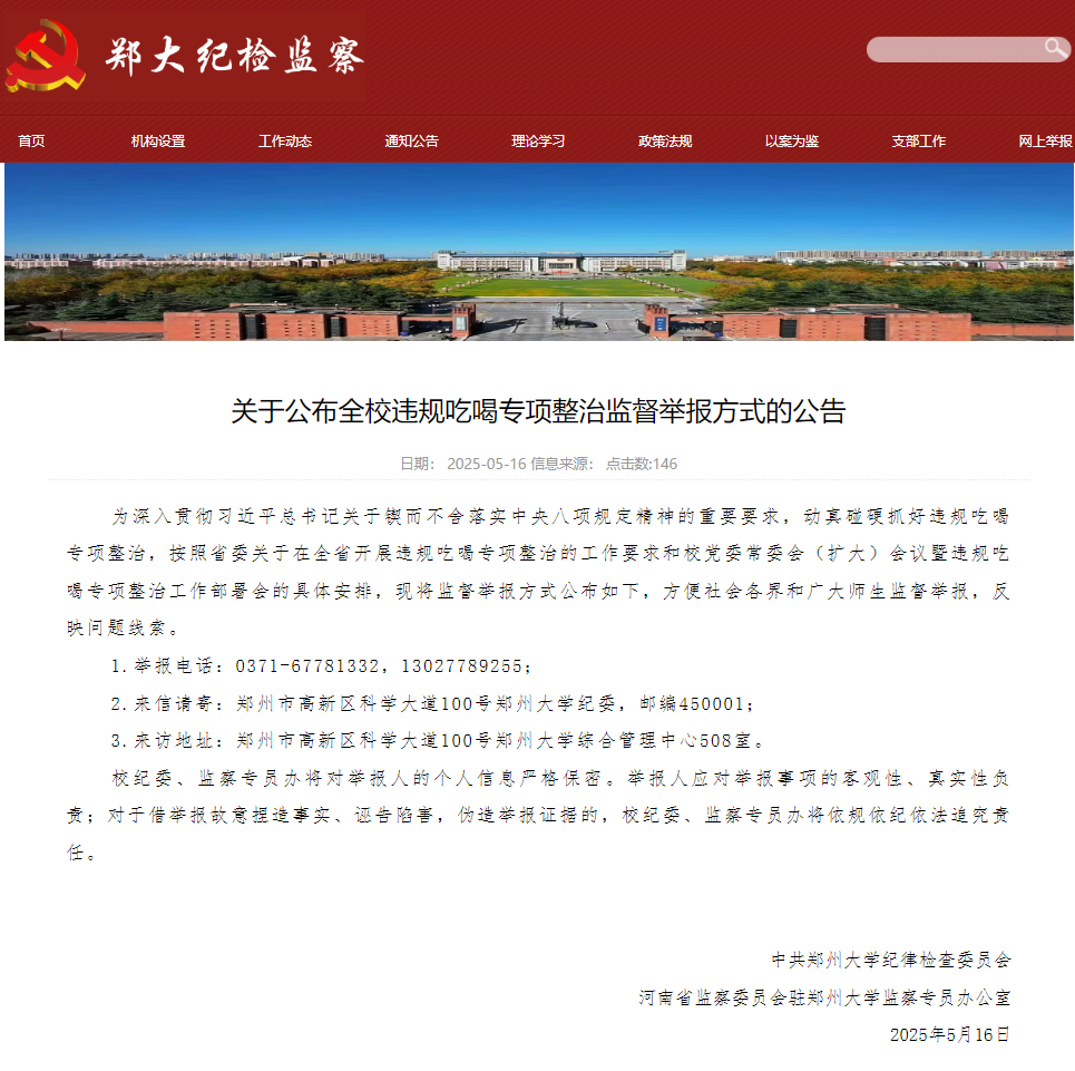 对标对表抓查摆。组织纪委、巡察、审计、财务、信访等部门系统梳理落实中央八项规定精神方面的突出问题。开展《中国共产党纪律处分条例》贯彻落实情况“回头看”,围绕2个方面21条问题开展自查。校领导班子及成员聚焦2个问题清单深查细照、自我检视,形成校领导班子问题清单10项17条,各二级单位形成领导班子问题清单495项566条,建立整治台账,细化整改举措,扎实推进整改。把警示教育作为学习教育的重要内容,梳理由风及腐、风腐一体典型案例7个,违反中央八项规定精神典型案例12个,发放《警示教育读本》,在网站、公众号公布典型案例138个。分层分类召开警示教育会,集中观看廉政警示教育片,深化以案促改促治,进一步筑牢党员干部的思想防线。开展“廉洁教育月”,举办2025届毕业生党员廉洁教育专题党课,举办“漫笔绘廉心——全国廉洁漫画精品展·郑大站”“诵读承廉韵清风沁人心——红色廉洁故事荟”等系列活动,以“寓廉于学、寓廉于教”理念,持续深化“清廉郑大”建设,厚植清廉基因,筑牢拒腐防变思想堤坝,营造风清气正校园生态。