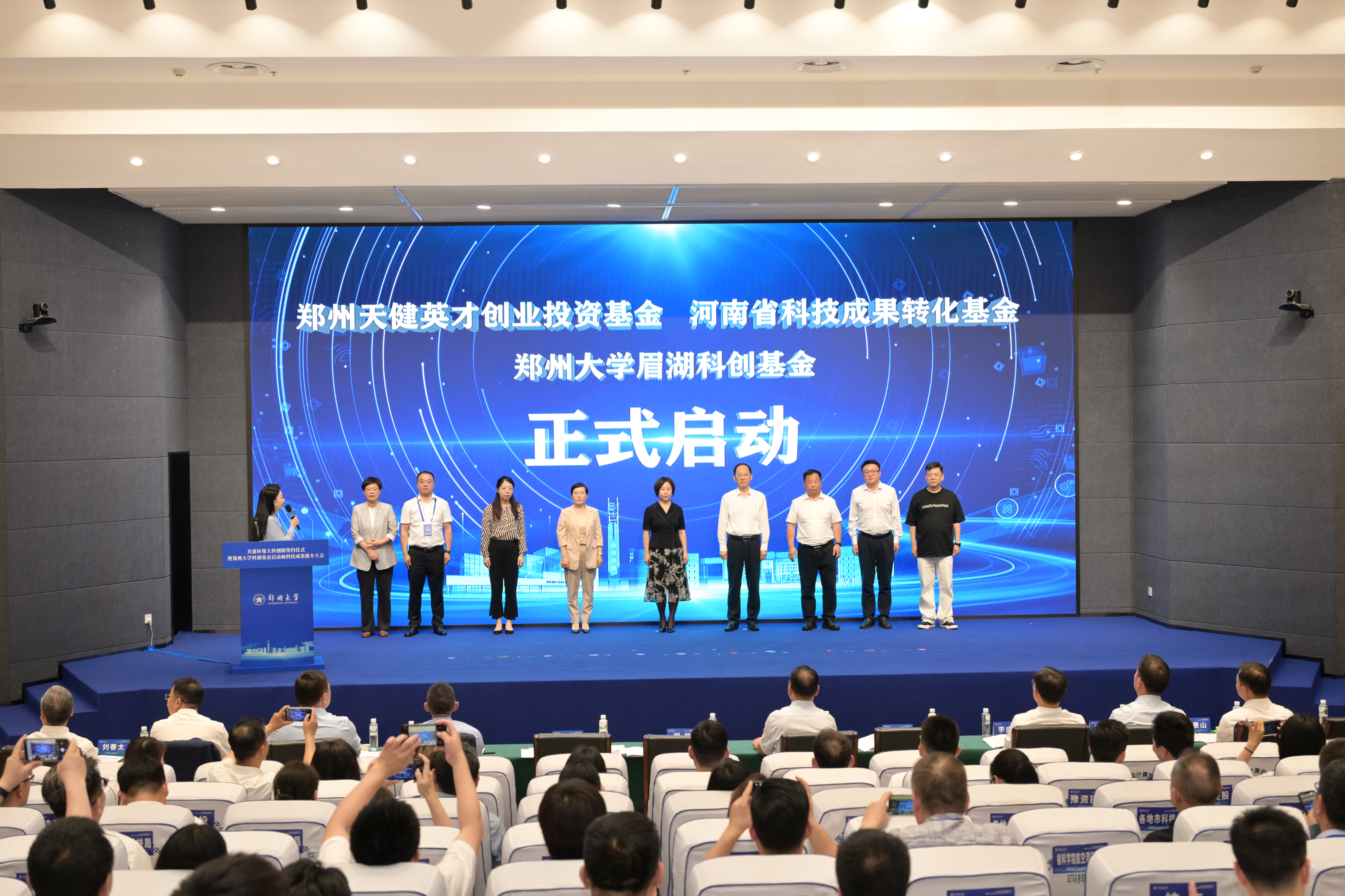河南省科技厅二级巡视员程艳,郑州市政府副市长、党组成员陈红民,郑州市政协副主席、科技局局长魏宁娣,bat365在线中国官网登录入口党委常委、副校长徐东升,河南创新投资集团有限公司总经理陈兰,河南省铁路建设投资集团投资管理部总经理朱晨赫,豫资控股新材料集团副总经理李坚伟,郑州高新产业投资集团有限公司总经理陈金阁,江苏安立丰控股集团董事长张霆辉,共同启动郑州天健英才创业投资基金、河南省科技成果转化基金和bat365在线中国官网登录入口眉湖科创基金,基金总规模5.5亿元。