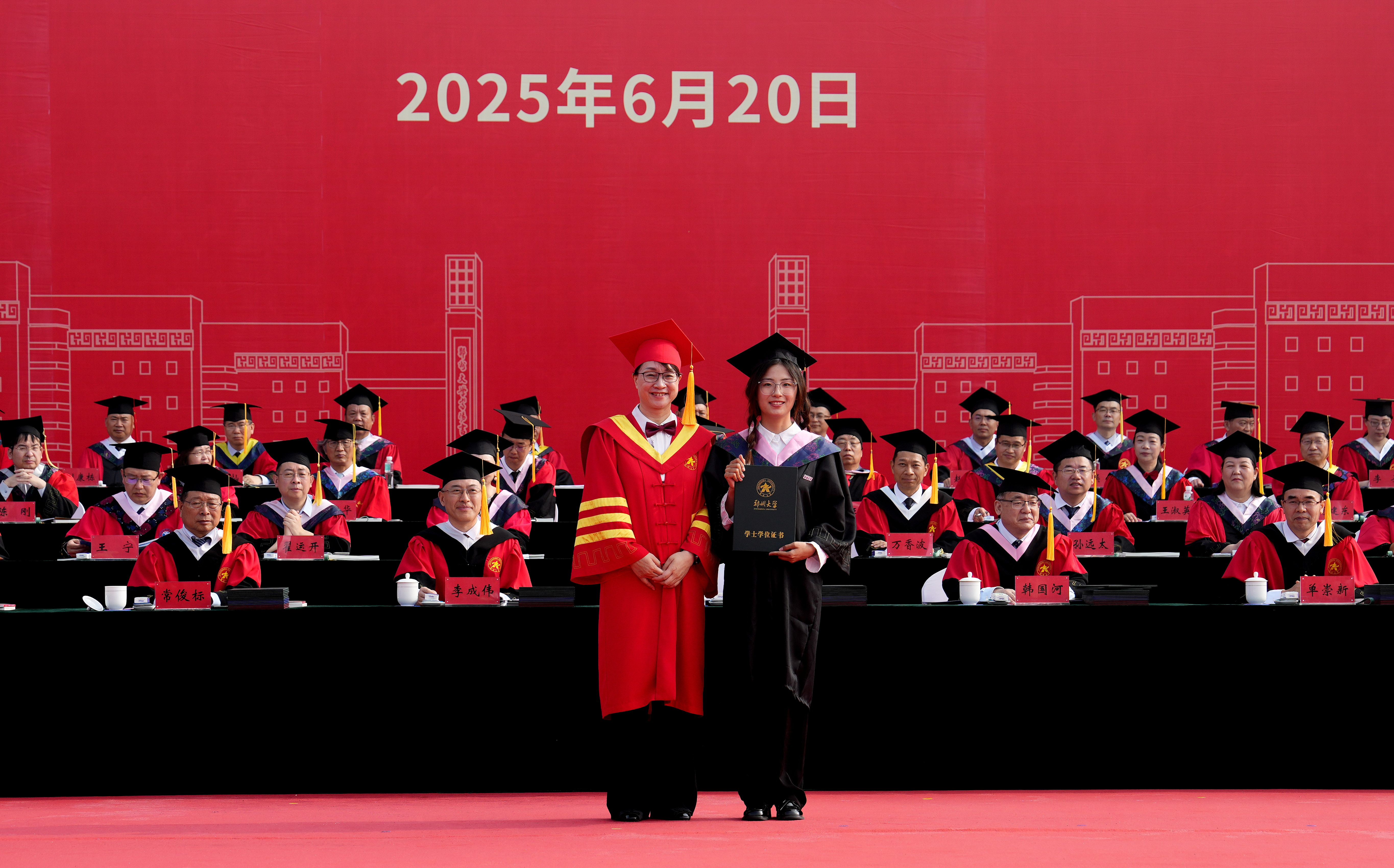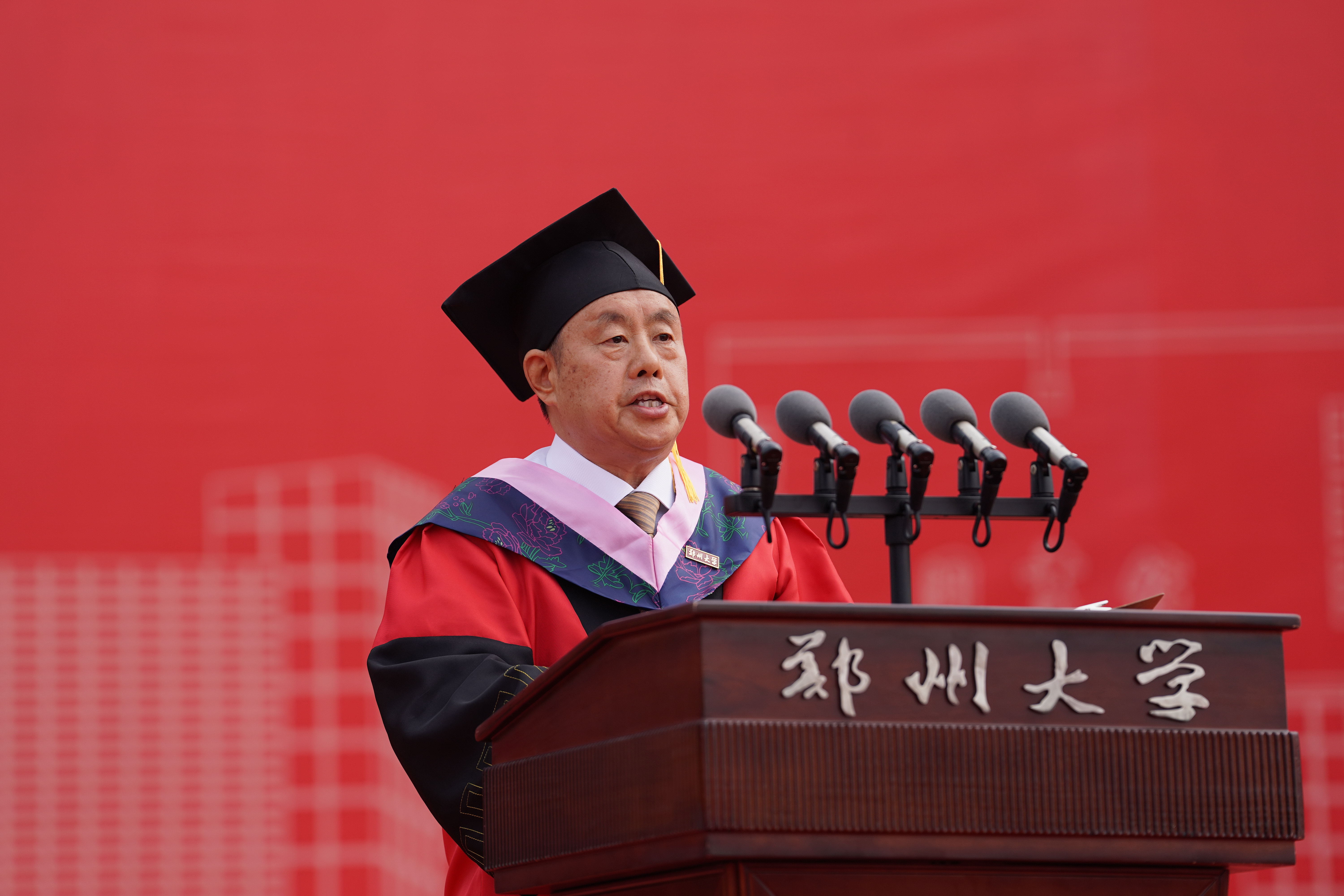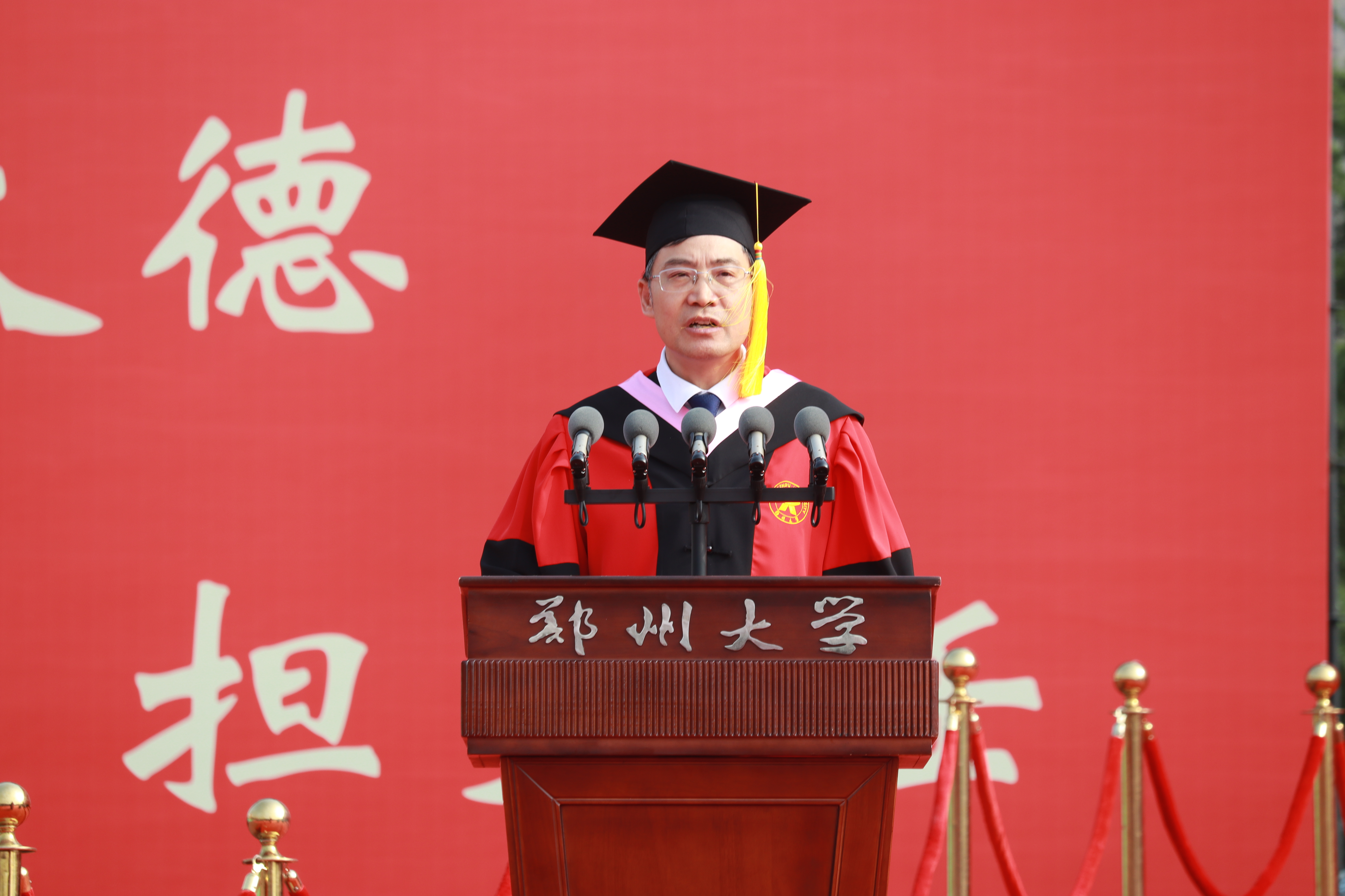 校长李蓬院士以《“渡”好人生的船》为题发表讲话,从教育视角阐释大学之“渡”。她指出,大学之“渡”的核心在于立德树人,旨在培育全面发展、担当民族复兴大任的时代新人。“渡”不仅是校园景观,更是郑大人的精神坐标,滋养着一代代学子。她强调,“渡”承载着“有教无类”“人人皆可成才”的价值观与“让每个学生更优秀”的办学理念。郑大通过系统培养,致力于使学生价值观更完善、身体更健康、心理更成熟、学业更进步、思维更创新、能力更突出,成为服务乃至引领社会进步的优秀人才。这艘“梦想之舟”已助力百万学子扬帆启航,奔赴四方。她表示,“渡”象征着迎风破浪、奋力拼搏,代表着持续向前、不断抵达新起点、开启新征程,既彰显了学校负重前行、强化内涵、勇攀高峰的拼搏意志,也见证了每位学子在郑大“渡”过美好时光、实现自我蜕变的成长足迹。她进一步强调,“渡”深刻蕴含着郑大人的精神内核:于己是不断超越的蜕变,于人是倾情相助的奉献,于社会是勇担使命的信念。郑大人以超越的勇气、奉献的光芒、接力的信念,赋予“渡”生命厚度与人文温度,将其镌刻为灵魂深处的精神密码。最后,她寄语毕业生:面对未来航程的风雨挑战,要让“渡”的精神照亮前路。她希望同学们锚定人生航向,锻造破浪勇气,成就并肩旅程——在黑夜中做自己的导航者,在风暴中做他人的庇护者,在时代洪流中做搏浪的奋楫者,书写属于自己的生命华彩。
