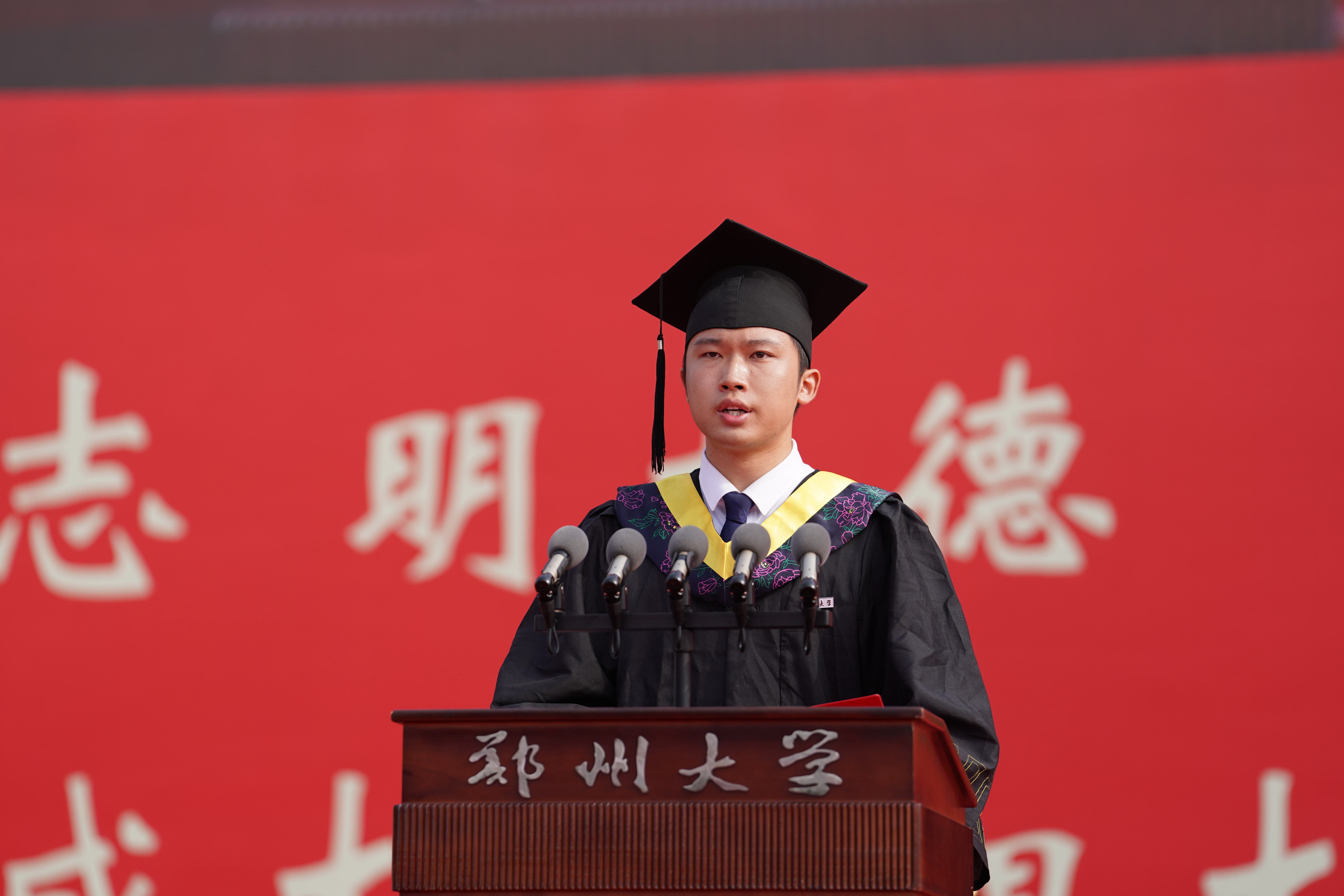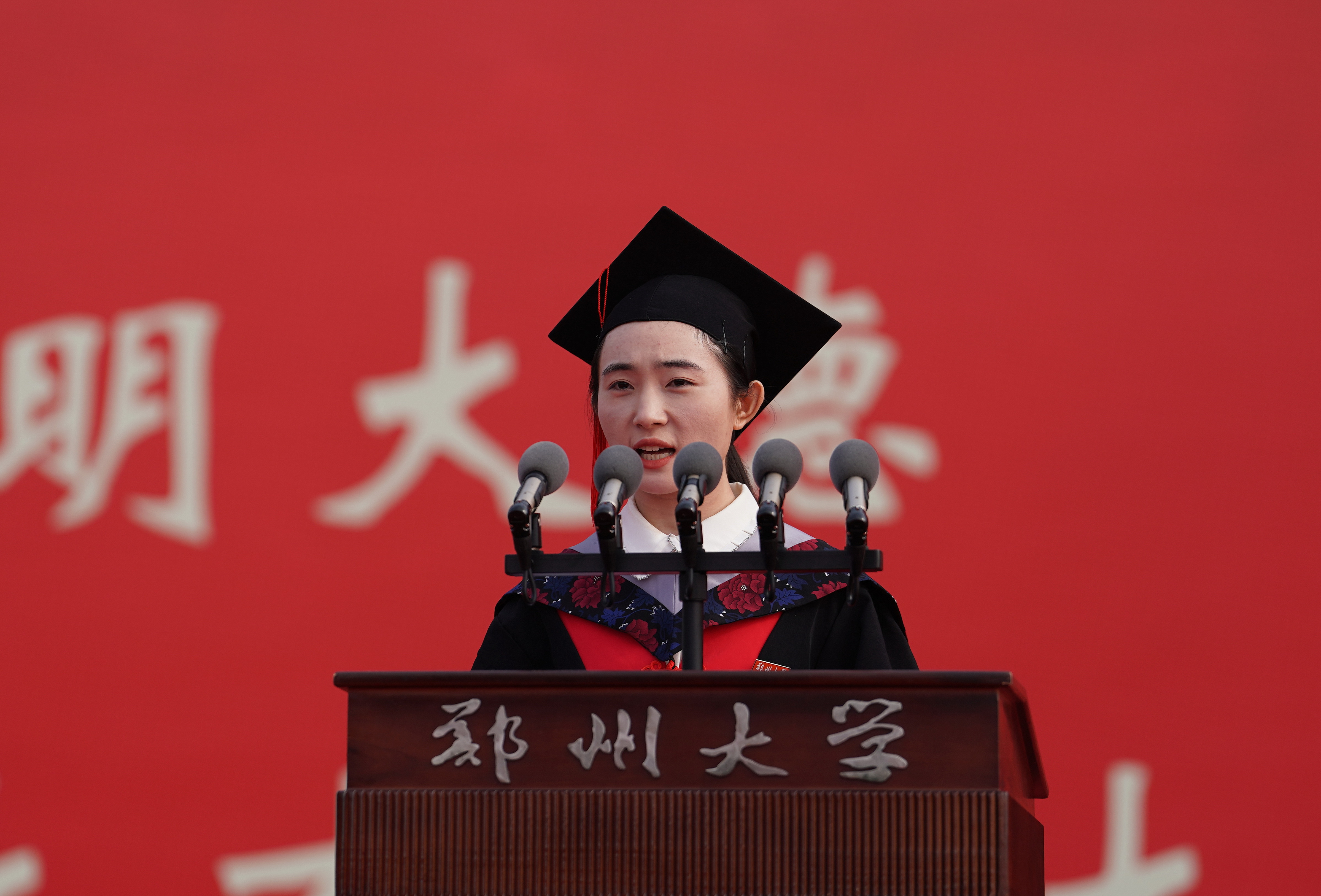 本科生代表、材料科学与工程学院邱洪辰,研究生代表、数学与统计学院张思惠,教师代表、法学院苗连营教授,家长代表、第一临床医学院本科毕业生王佳煦的家长许伟分别发言。