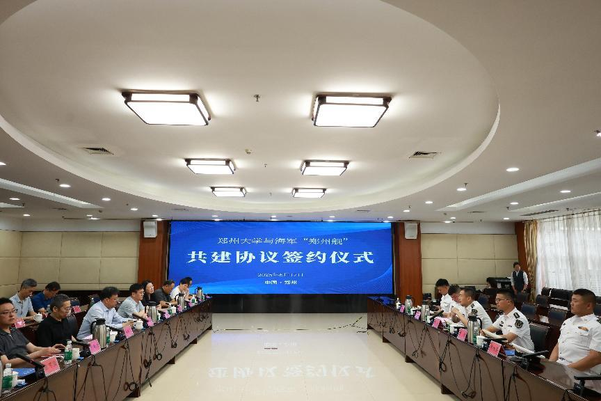双方签署双拥共建协议。王利国代表学校接受海军郑州舰舰艇模型捐赠,并向郑州舰官兵代表颁发捐赠证书,回赠承载郑大精神的《郑大故事》书籍。