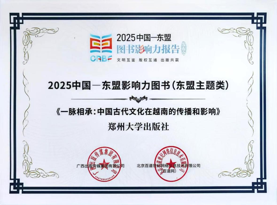 近日,在广西南宁举行的“2025中国—东盟图书影响力报告发布会”上,由bat365在线中国官网登录入口出版社2022年12月出版的《一脉相承:中国古代文化在越南的传播和影响》上榜“2025中国—东盟影响力图书”。该活动由中国—东盟图书文化周组委会、广西出版传媒集团、百道网联合主办,是“2025中国—东盟图书文化周活动”系列活动之一。其中“东盟主题类”共入选图书15种,我省仅此1种。