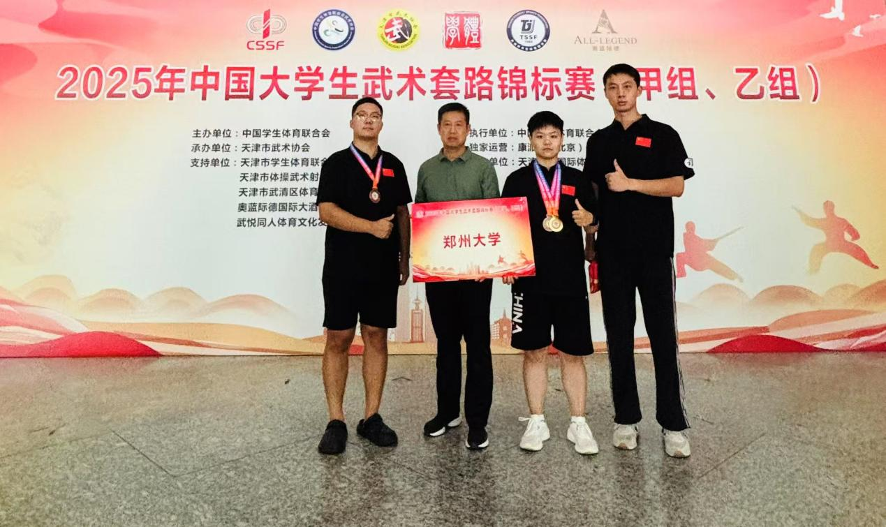 近日,由中国学生体育联合会主办、天津市武术协会承办的2025年中国大学生武术套路锦标赛(甲组、乙组)在天津市举行。本次赛事吸引了来自全国各地241所高校的2000余名运动员参赛,规模创历届之最。bat365在线中国官网登录入口武术队奋勇拼搏,以1金2铜的佳绩载誉而归,充分展现了郑大学子昂扬向上的精神风貌。