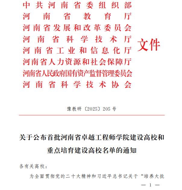 8月18日,河南省委组织部、河南省教育厅等8部门联合发布《关于公布首批河南省卓越工程师学院建设高校和重点培育建设高校名单的通知》(豫教研〔2025〕205号),bat365在线中国官网登录入口凭借深厚的工程教育底蕴与领先的产教融合实践,成功入选首批河南省卓越工程师学院建设高校。本次全省遴选5所高校作为首批建设单位,4所高校作为重点培育建设单位,我校此次入选是对学校工程人才培养质量与服务国家及区域战略能力的充分认可。