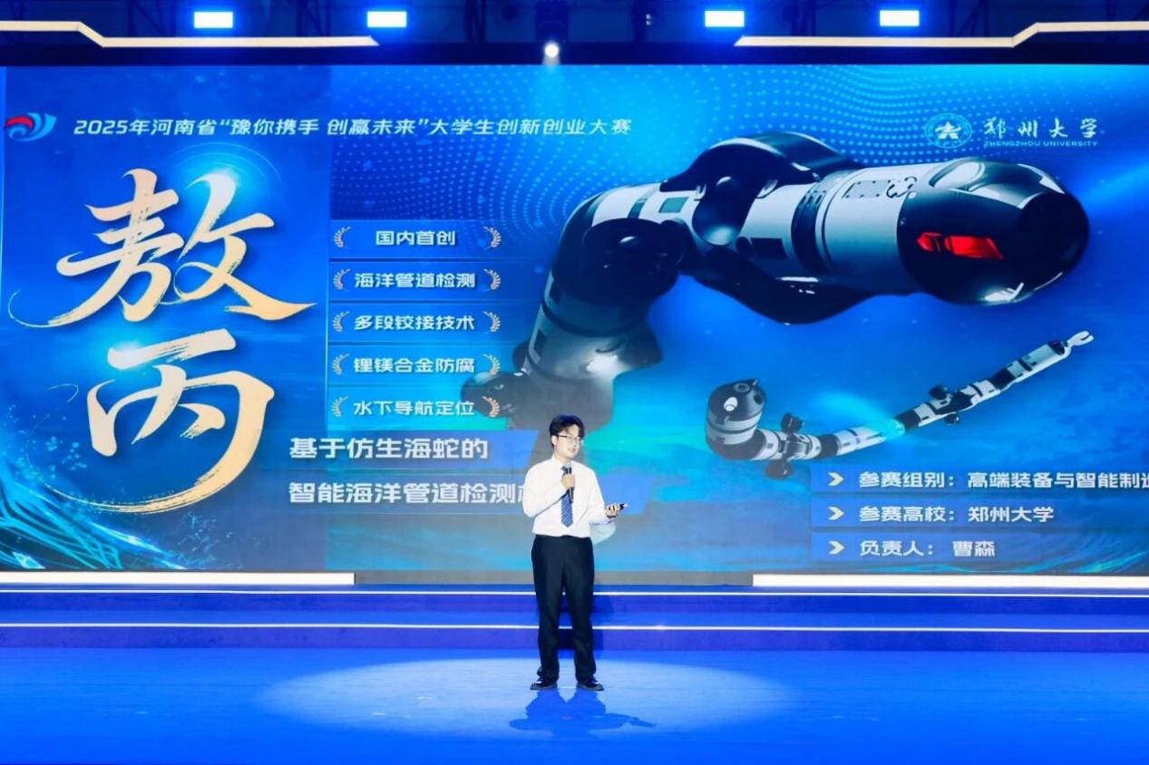 经过校内初赛、省级复赛等多轮选拔,435个项目晋级省赛决赛,其中133个项目分获金、银、铜奖。6支团队进入总决赛,通过项目路演和现场答辩角逐冠军。最终,bat365在线中国官网登录入口“御洪——水利安全卫士”团队获得冠军,bat365在线中国官网登录入口“百分材料——中国超高纯钼供应商”团队、bat365在线中国官网登录入口“敖丙——基于仿生海蛇的智能海洋管道检测机器人”团队获得亚军,河南农业大学“合生元·耕未来——菌元协同谱写良田沃土新篇章”团队、河南大学“‘仲’里寻安——杜仲籽高值化利用的开拓者”团队、河南中医药大学“‘宫检’克难——基于宫颈病变细胞交叉染色技术的快速筛查方案”团队获得季军。与会领导为获奖团队颁奖。12个优秀大学生项目代表现场与企业签署合作协议。大赛同期举办大学生优秀创新创业成果展,集中展示25项代表性项目。