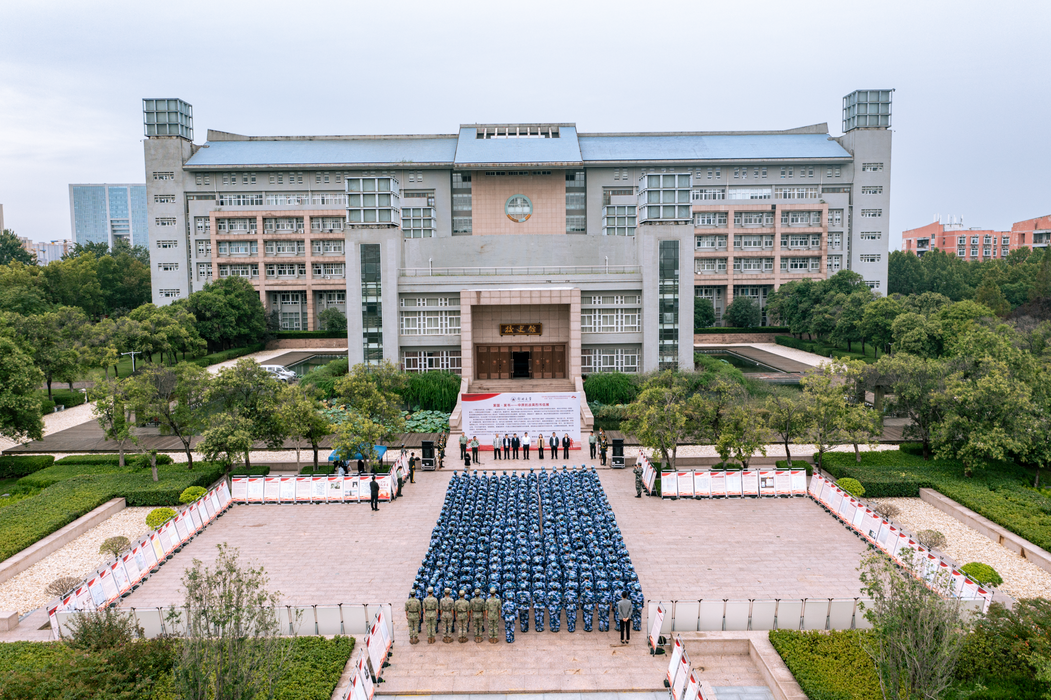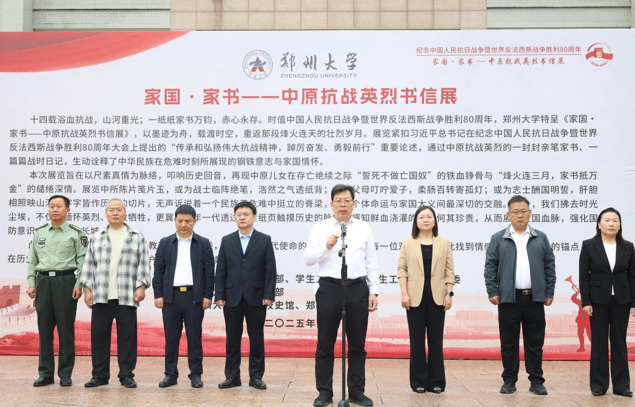 9月18日,bat365在线中国官网登录入口纪念中国人民抗日战争暨世界反法西斯战争胜利80周年“家国·家书——中原抗战英烈书信展”开幕式在主校区举行。校党委副书记王利国出席仪式并讲话。校党委常委、宣传部部长孙保营,党委学生工作部、人民武装部、党委研究生工作部、校团委、档案与校史馆、出版社等单位负责同志,新生承训教官代表、各学院教师代表、国旗护卫队队员代表及2025级新生代表等共300余人参加活动。