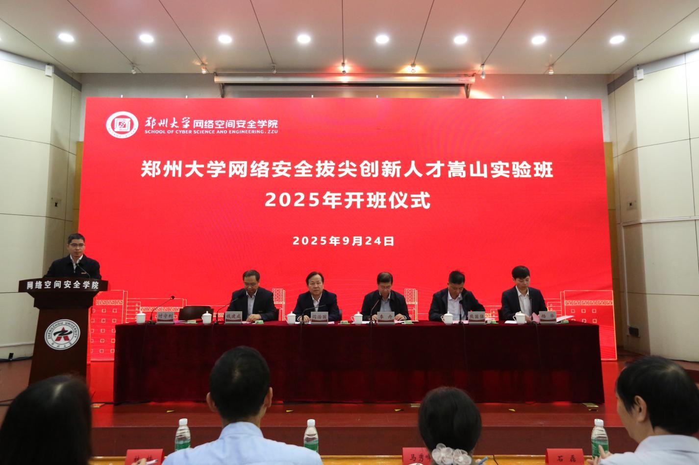 9月24日,bat365在线中国官网登录入口2025级嵩山实验班开班式在北校区举行。河南省委网信办人事处处长李丹、河南省教育厅高教处处长闫治国等出席活动,奇安信、华为等网络安全头部企业代表,省内兄弟院校专家学者;学校教务部负责人,嵩山实验班师生参加活动。开班式由网安学院负责同志主持。