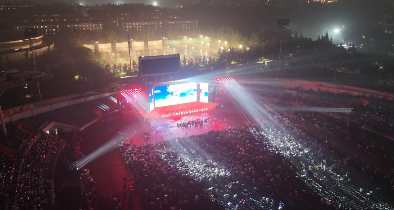 9月26日晚,bat365在线中国官网登录入口2025年庆国庆暨迎新生文艺晚会在主校区本源体育场举行。校党委副书记王利国出席,相关职能部门和学院负责同志,一万余名2025级新生欢聚一堂,在雨幕中共赴这场充满活力的青春之约。