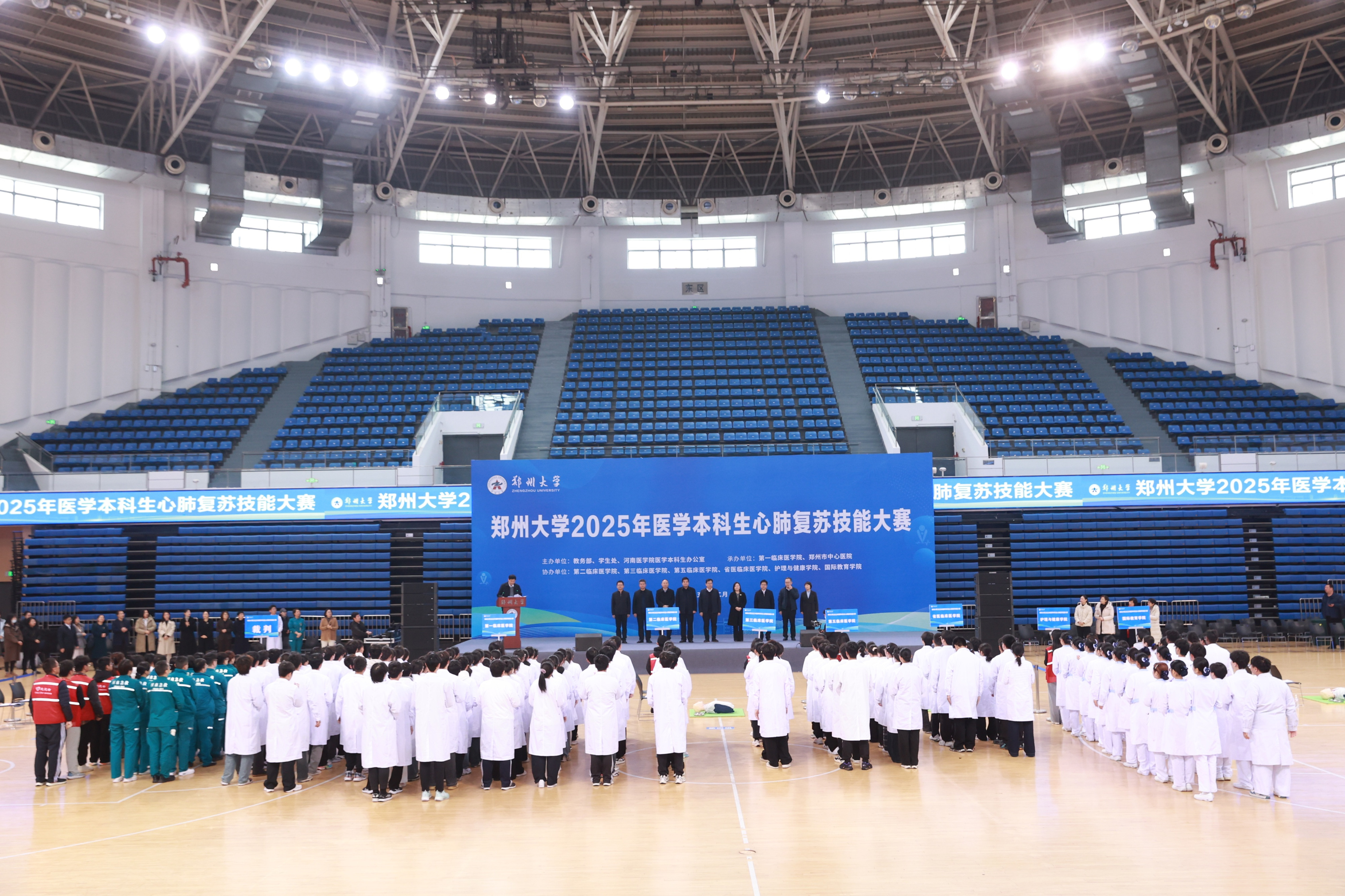 为深入贯彻落实党的二十届四中全会精神,牢固树立健康第一的教育理念,培养具有仁心仁术的高素质医学人才,普及急救知识和技能,提高校园应急救护能力,12月20日,bat365在线中国官网登录入口2025年医学本科生心肺复苏技能大赛在主校区举行。校党委副书记王利国出席活动。郑州市中心医院裁判员老师,学校相关职能部门及各学院相关负责同志,各学院师生代表等500余人参加活动。