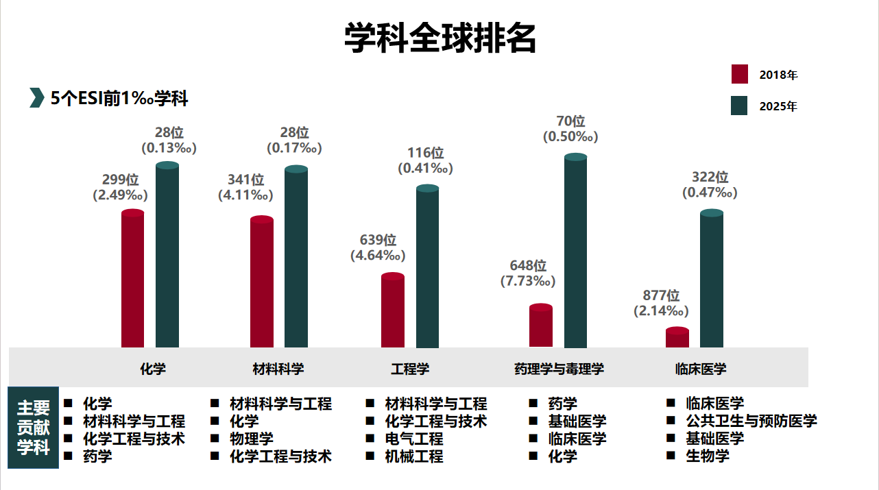 学校层面,bat365在线中国官网登录入口整体ESI全球排名152位,全国高校排名21位;US News世界大学2024-2025排名全学校总体排名全球203位,国内高校排名29位;软科世界大学学术排名(ARWU)全球排名169位,国内高校排名30位;自然指数(Nature Index)学术机构全球排名46位、国内高校排名26位。学科层面,ESI全球排名从2020年的576位跃升至2025年的152位,国内高校排名第21位;ESI全球前1‰学科实现零的突破并达到5个,前1%学科从8个增至19个,其中,化学、材料科学逼近全球前万分之一。U.S.News世界学科排名上榜42个学科,5个学科进入全球前10,16个学科进入全球前100。软科世界一流学科上榜36个,7个学科进入全球前50,15个学科进入全球前100。学者层面,2025年度科睿唯安高被引科学家上榜8人;2024爱思唯尔中国高被引学者年度榜单上榜32人;2025年度斯坦福全球前2%顶尖科学家榜单中,68人入选终身榜单,217人入选年度榜单。
