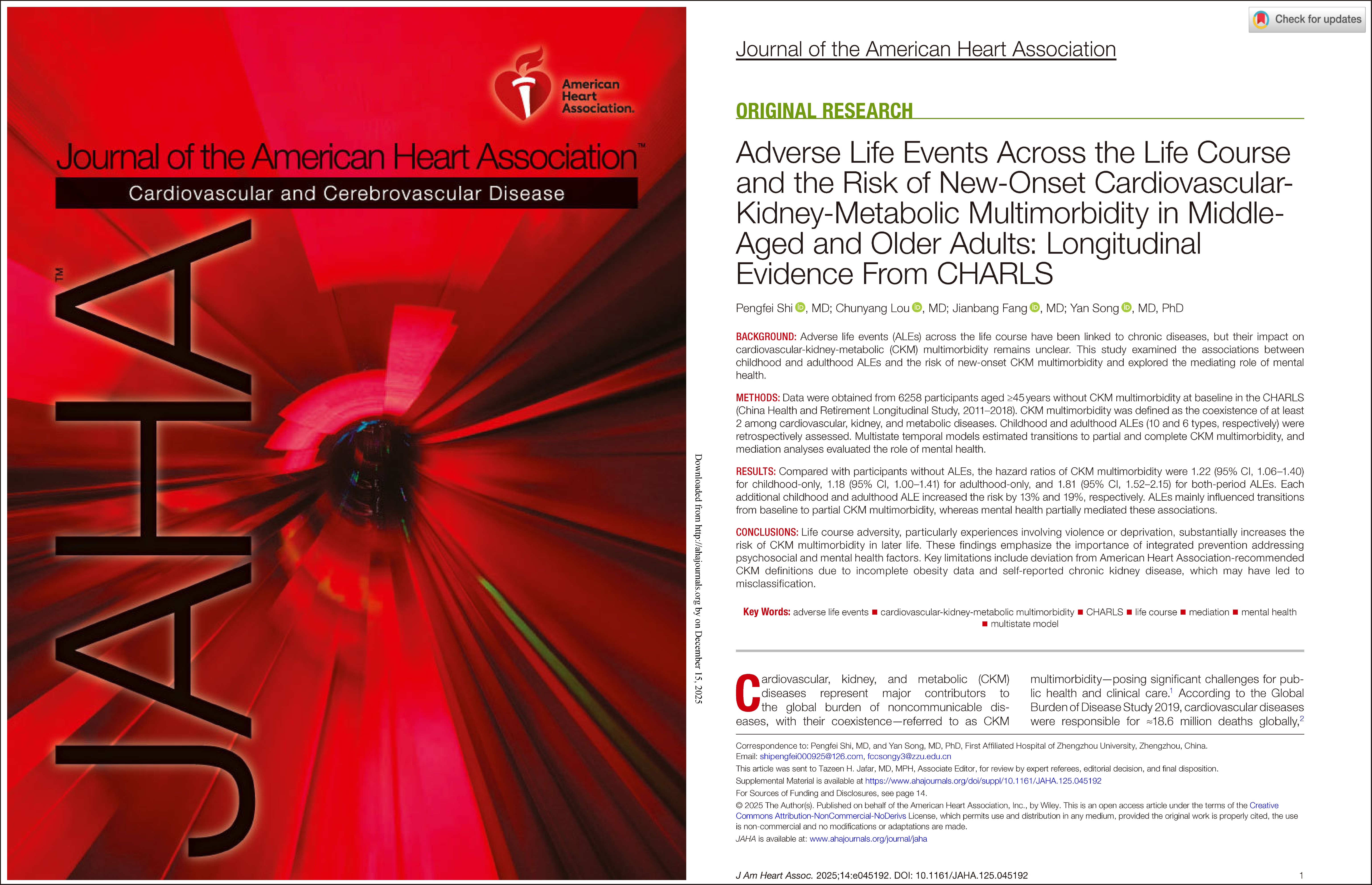 相关研究成果以“Adverse Life Events Across the Life Course and the Risk of New-Onset Cardiovascular-Kidney-Metabolic Multimorbidity in Middle-Aged and Older Adults: Longitudinal Evidence From CHARLS”为题,发表于美国心脏协会(AHA)主办的国际心血管领域权威期刊《Journal of the American Heart Association》上。bat365在线中国官网登录入口第一附属医院血管外科宋燕教授为本文通讯作者、2023级硕士研究生石鹏飞为第一作者。该研究获得河南省自然科学基金等项目的资助。