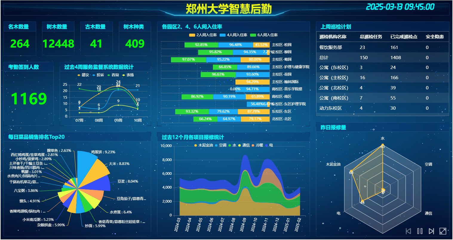 后勤服务坚持规范化、标准化、智能化方向,推动保障能力全面提质升级。一是制度标准体系日趋完善。系统构建涵盖后勤主要领域的32项规章制度、30个服务标准体系,实现管理与服务规范化、制度化运行。二是管理模式创新见效。在学生食堂推行7S管理、学生宿舍实行6T管理,引进先进理念,有效提升服务场所的安全、效率与品质。三是硬件设施更新换代。在学生宿舍楼等处安装人脸识别门禁系统253套,实施老旧学生宿舍改造,更新教室课桌椅,安装节能灯具,基础条件持续改善。四是服务供给多元拓展。以BOT模式在主校区、北校区提供465间层浴服务;引入校园交通车、优化路网;吸引肯德基、星巴克等知名商业品牌入驻,构建更加便捷丰富的校园生活服务生态。五是物业服务优化升级。稳步扩大物业服务社会化范围,完成多栋学生宿舍、公寓及办公实验楼的物业招标与进驻,服务质量进一步提升。六是智慧后勤便捷高效。建成集成8大子系统、实时呈现12类服务数据的可视化平台,畅通1234服务热线、一站式线上平台等渠道,实现师生诉求直达快办,服务响应效率显著提升。