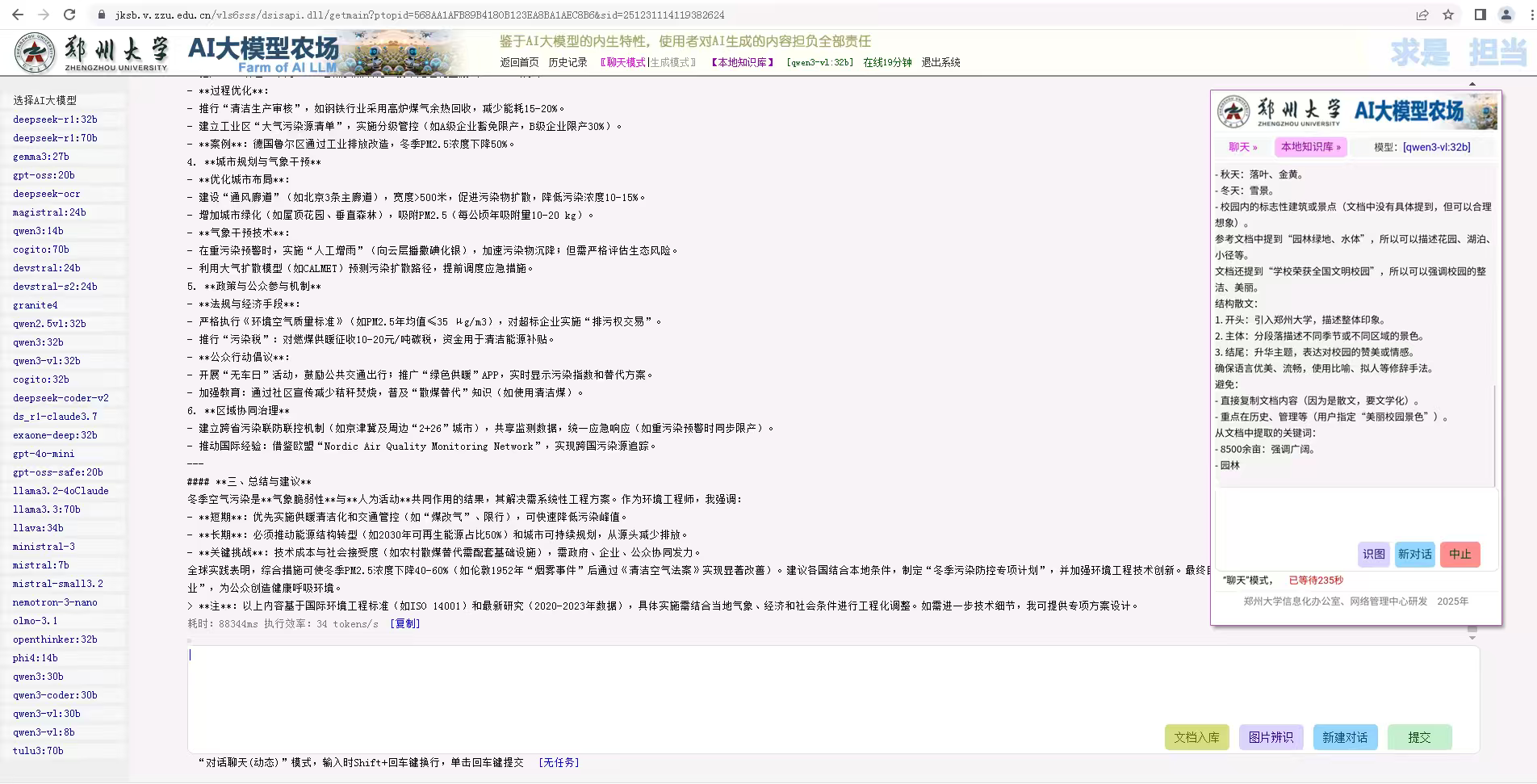 信息化工作以“支撑大学治理体系和治理能力现代化”为目标,扎实推进“数字化校园”建设。一是基础能力大幅增强。CPU核心数从1.05万提升至3.4万核心,内存从10TB扩容至73TB,存储从2.3PB增长至7.2PB,实现数倍增长,校园网完成光网改造,“四网”融合率达到95%,奠定坚实数字基座。二是应用生态日益丰富。建设微服务174个、微应用136个、办事和服务流程572个,校级应用软件系统和平台达到106个,基本实现各业务板块管理数字化,全面服务师生教学科研生活。三是数据治理与AI应用初见成效。建成学校数据中台,治理54个关键系统数据,发布丰富的数据清单与接口;自主构建AI大模型农场,提供30多个主流模型服务,访问量达45.1万人次,“智慧大脑”不断进化。四是智慧教育示范引领。建设“地方高校101计划课程和学习示范平台”,融合AI大模型等技术探索个性化教学,入选河南省“人工智能+高等教育”典型应用场景案例;建成“河南省高等学校人工智能学习教育平台”,48所本科高校完成身份对接,面向全省高校开放,服务能力不断深化拓展。五是网络安全坚实稳固。建成并运行校园网络安全运营中心,完善舆情监测与网络安全协同机制,有效保障校园网络空间安全。