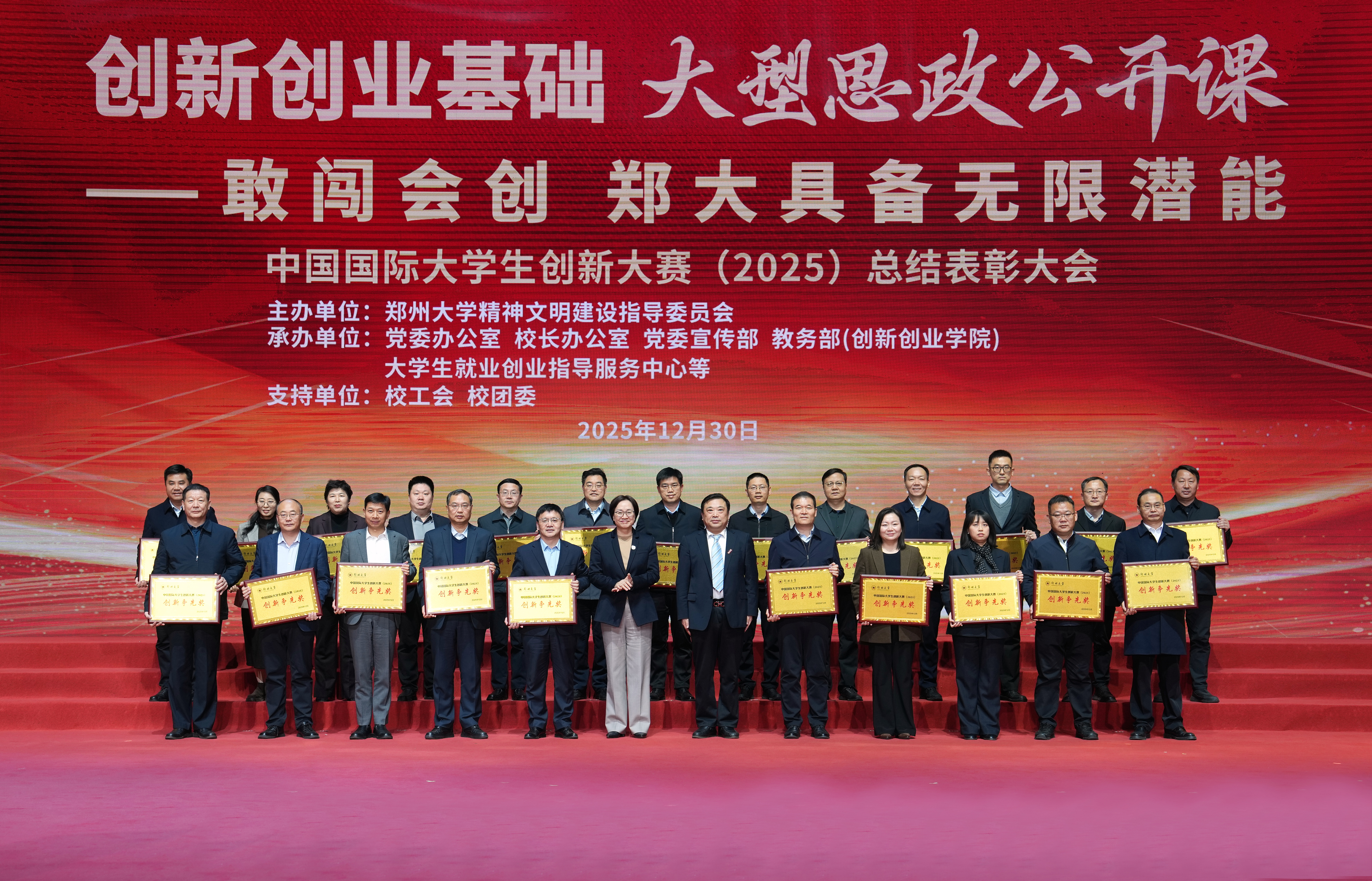 为深入落实立德树人根本任务,全面总结国创赛育人成果与办赛经验,表彰先进典型、凝聚奋进力量,并对2026年大赛进行动员部署,2025年12月30日晚,中国国际大学生创新大赛(2025)总结表彰大会暨“敢闯会创——郑大具备无限潜能”大型思政公开课在bat365在线中国官网登录入口主校区中心体育馆举行。全体在校校领导,省教育厅、郑州市教育局有关部门负责同志出席,大赛各专项组成员、金奖项目师生代表、志愿者及师生代表约1000人现场参加,活动同步线上直播,打造了一堂气势恢宏、形式多样、内容丰富的思政“金课”。
