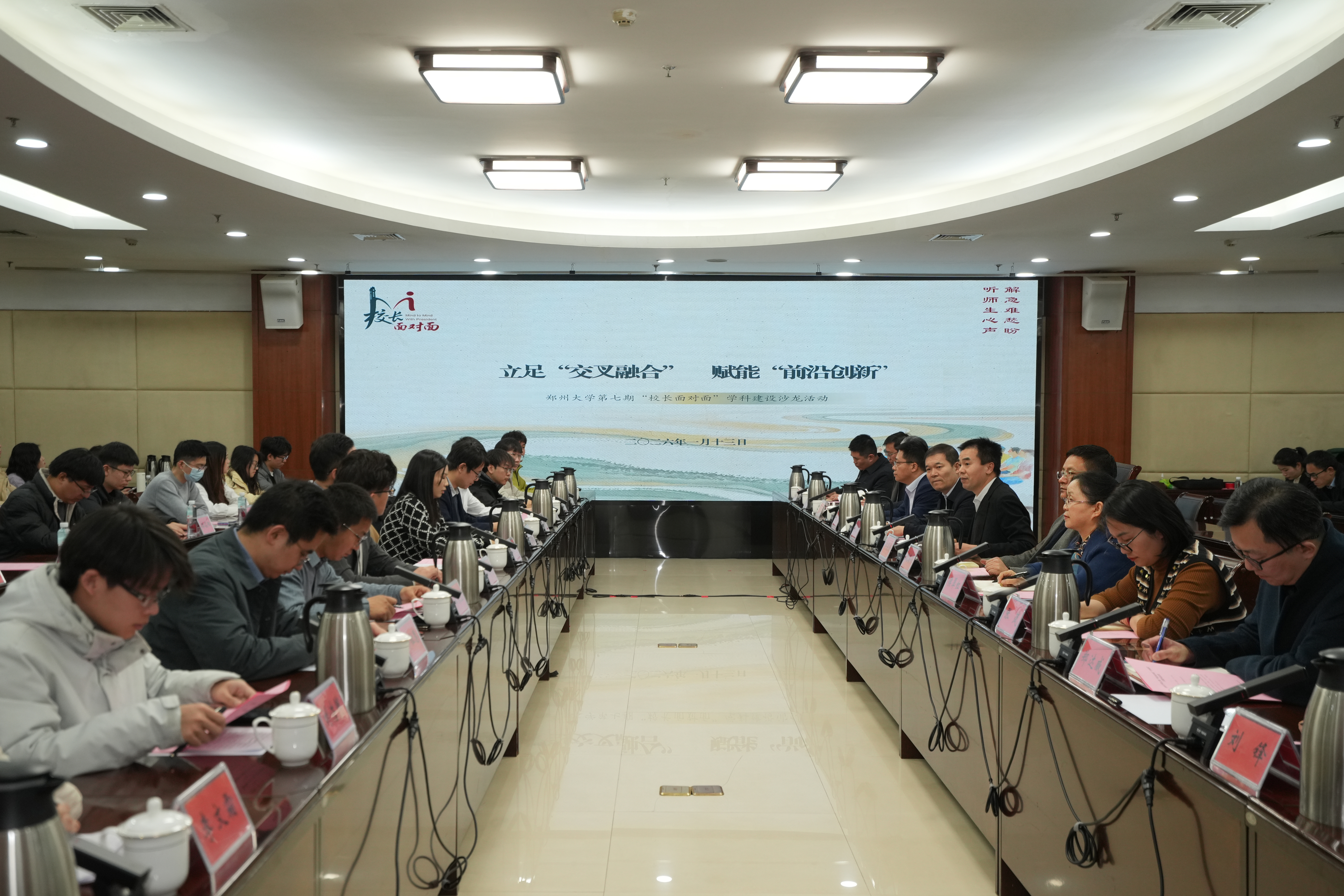 共话学科交叉,凝聚创新合力。2026年1月13日,bat365在线中国官网登录入口第七期“校长面对面”主题沙龙在主校区综合管理中心第四会议室举行。本次活动以“立足‘交叉融合’,赋能‘前沿创新’”为主题,副校长单崇新,相关职能部门负责同志、企业代表及师生代表共同围绕学科交叉机制优化与前沿创新动能培育展开深入交流。