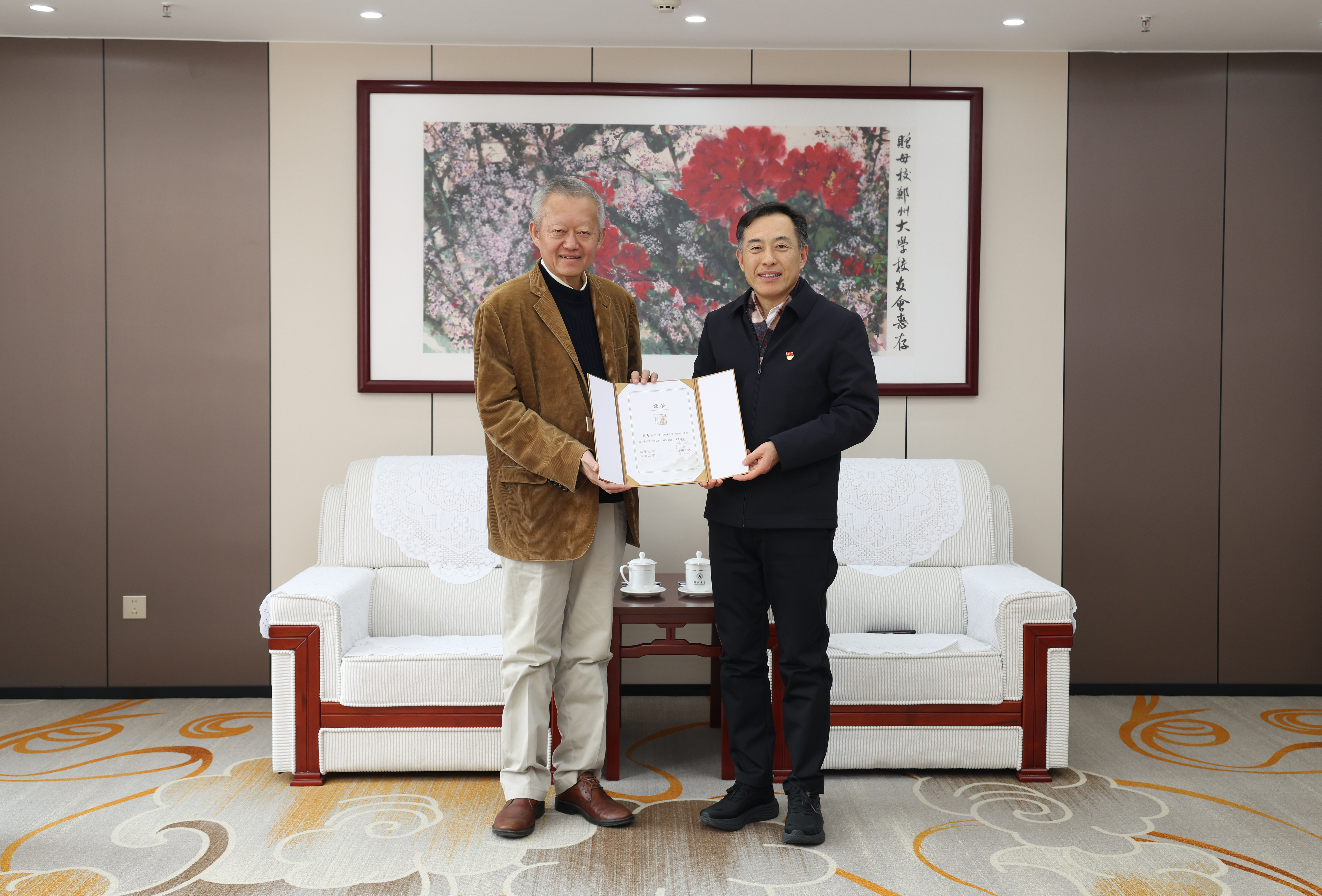 校党委书记李成伟为陈春声颁发“嵩阳大讲堂”主讲嘉宾证书。