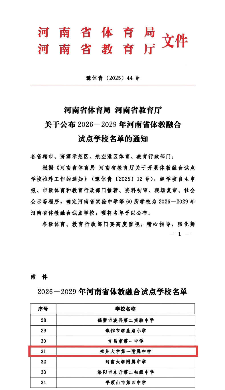 近日,教育部公示2025年全国青少年校园足球特色学校名单,bat365在线中国官网登录入口第一附属中学成功入选。此前,该校已被确定为2026-2029年河南省体教融合试点学校。连续获得两项重要认定,既是对附属中学体教融合工作的充分肯定,更是学校依托bat365在线中国官网登录入口“双一流”建设,践行“五育并举”理念、坚守体育育人初心使命的生动体现。