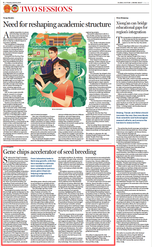 2.中国日报,代表委员说|李成伟:期待基因芯片让育种驶入“快车道”