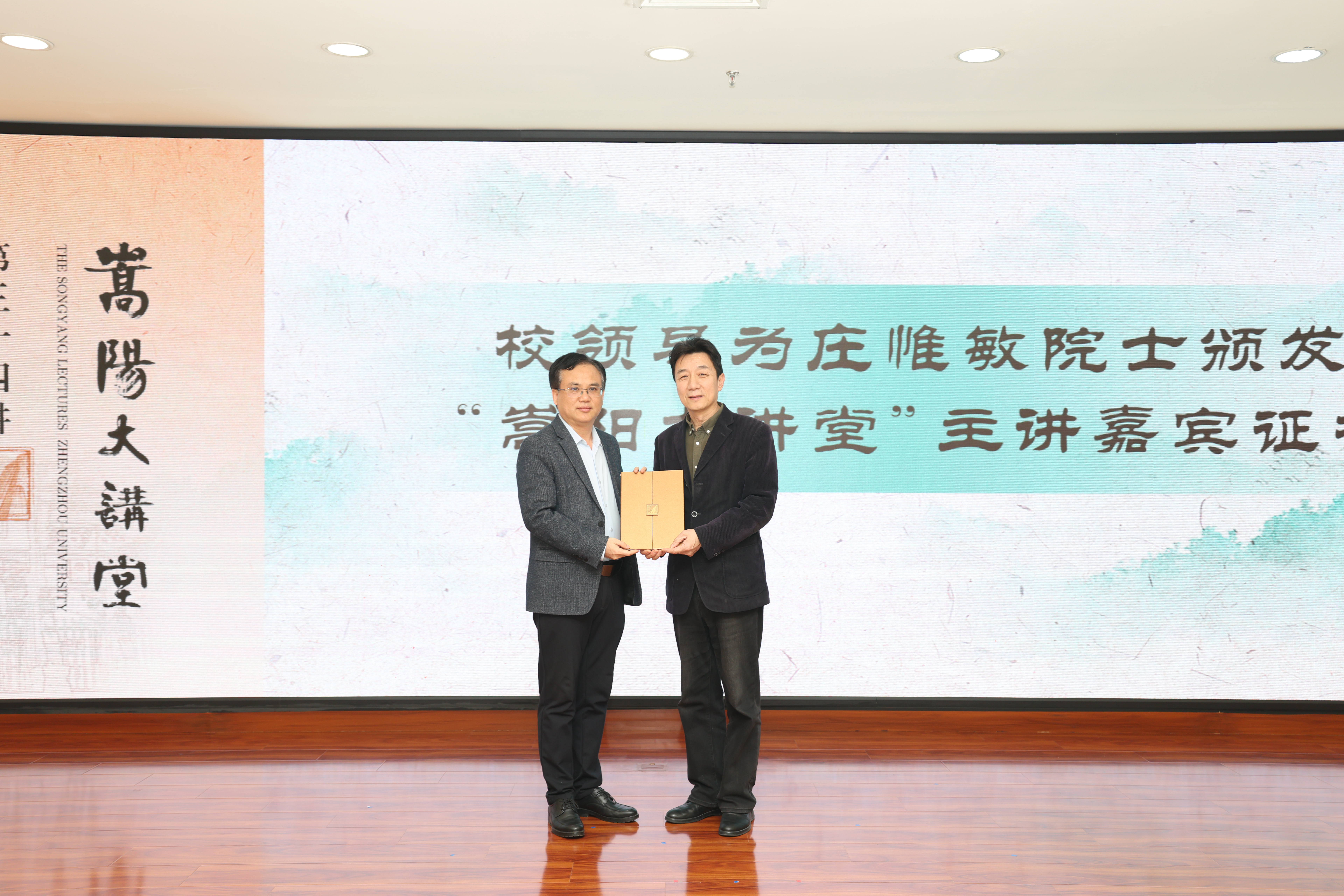 臧双全为庄惟敏颁发“嵩阳大讲堂”主讲嘉宾证书。