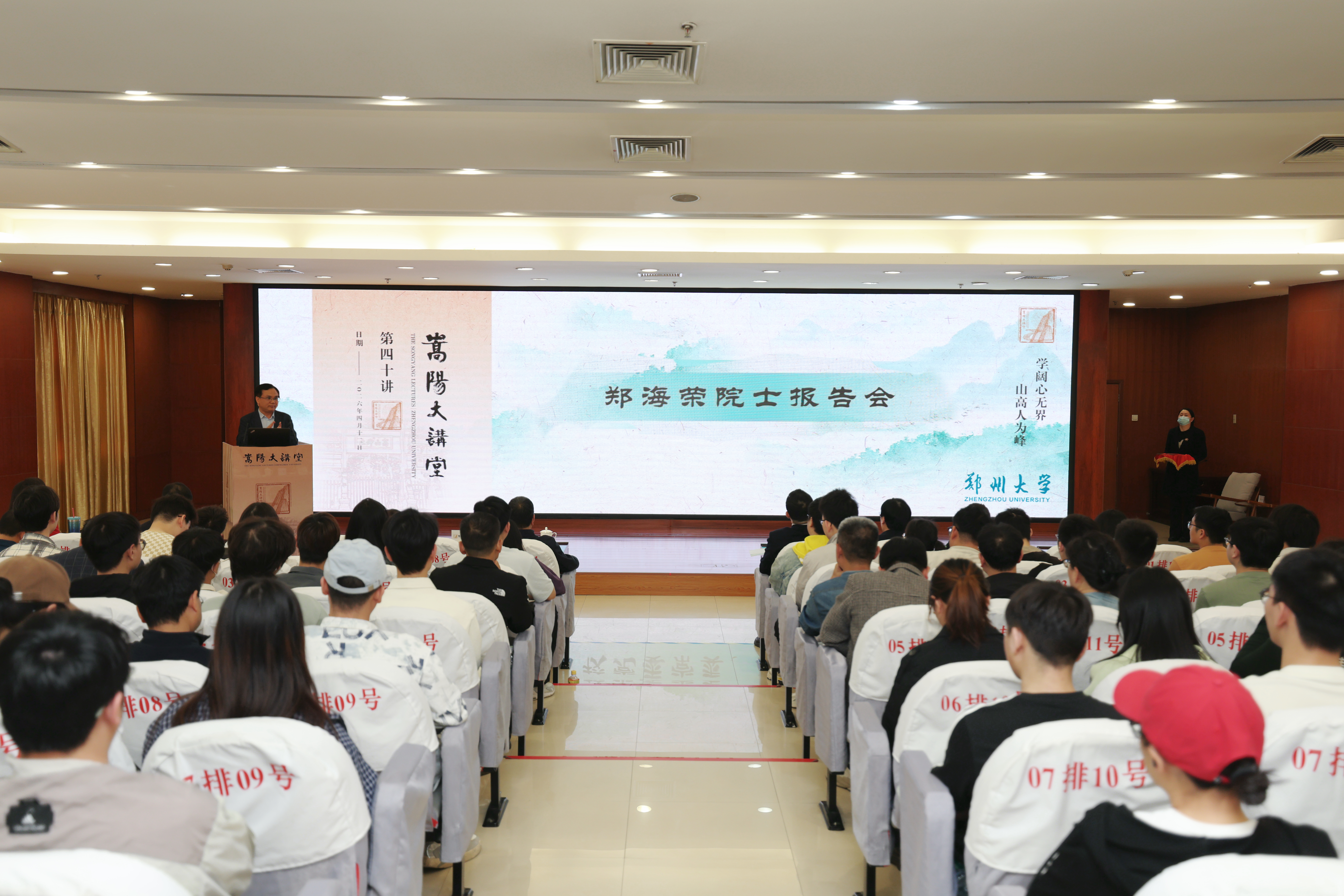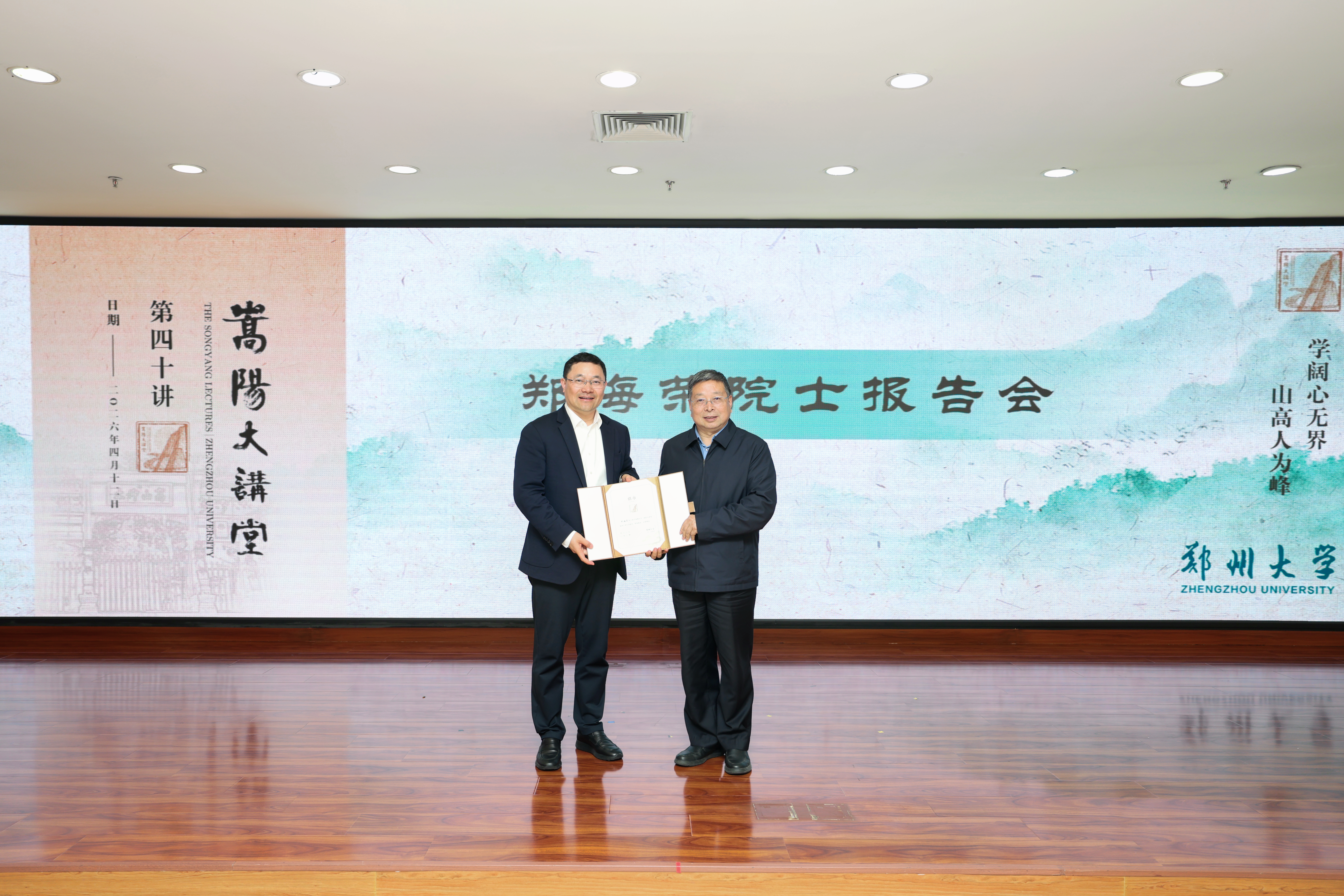 常俊标为中国科学院院士,南京大学党委常委、常务副校长郑海荣颁发“嵩阳大讲堂”主讲嘉宾证书。